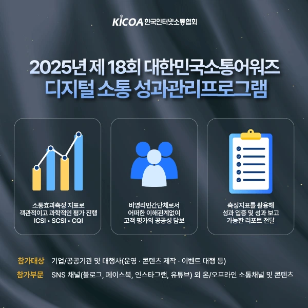올해 18회를 맞이하는 대한민국소통어워즈는 단순한 인기투표 방식의 평가가 아닌 기관·기업의 커뮤니케이션 전략 전반을 지표화하고 체계적으로 진단하여 성과를 입증하고 성과를 확산하는 성과관리 프로그램으로 진행되고 있습니다. 대한민국소통어워즈를 주최하는 (사)한국인터넷소통협회는 국내 최초 SNS 소통 시상 제도를 제정하며 인기투표에 의한 시상이 아닌 어떠한 이해 관계없는 공정한 지표 기반의 평가를 진행해오고 있습니다.