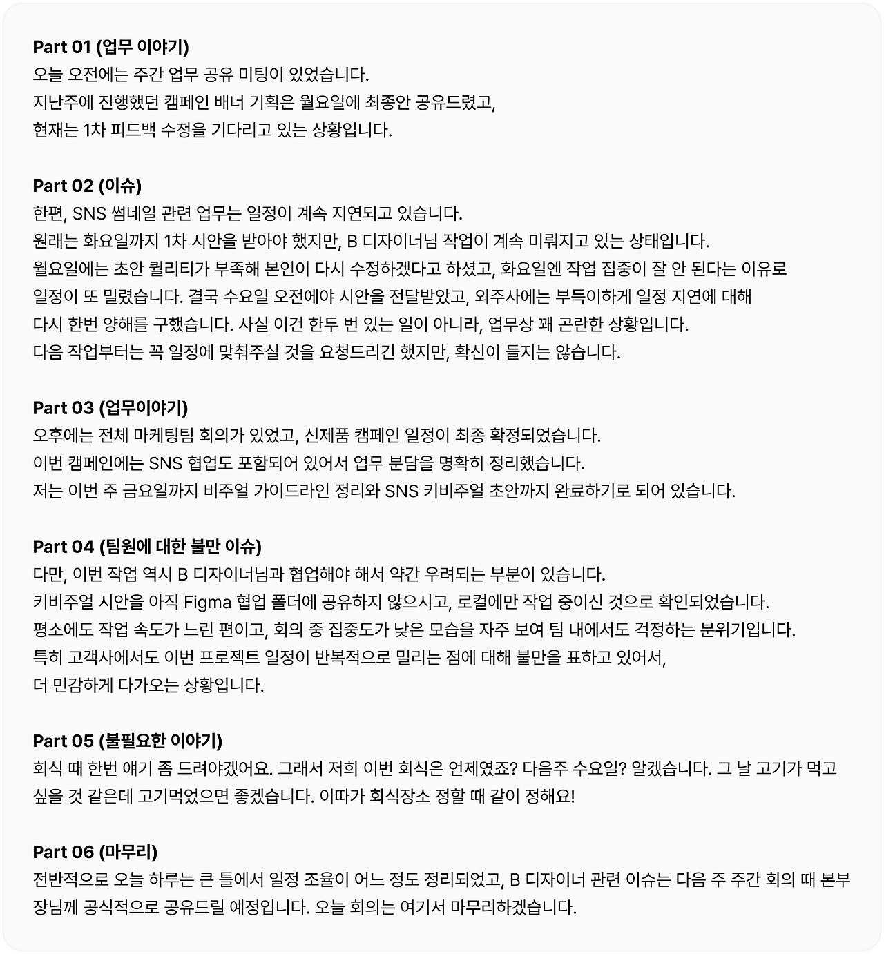 → 단순히 시간대별로 요약만 제공하고, 중복 제거, 맥락 정리, 불필요한 정보 필터링이 부족하여 논리적으로 재구성된 회의록 형태로 활용하기 어렵습니다.