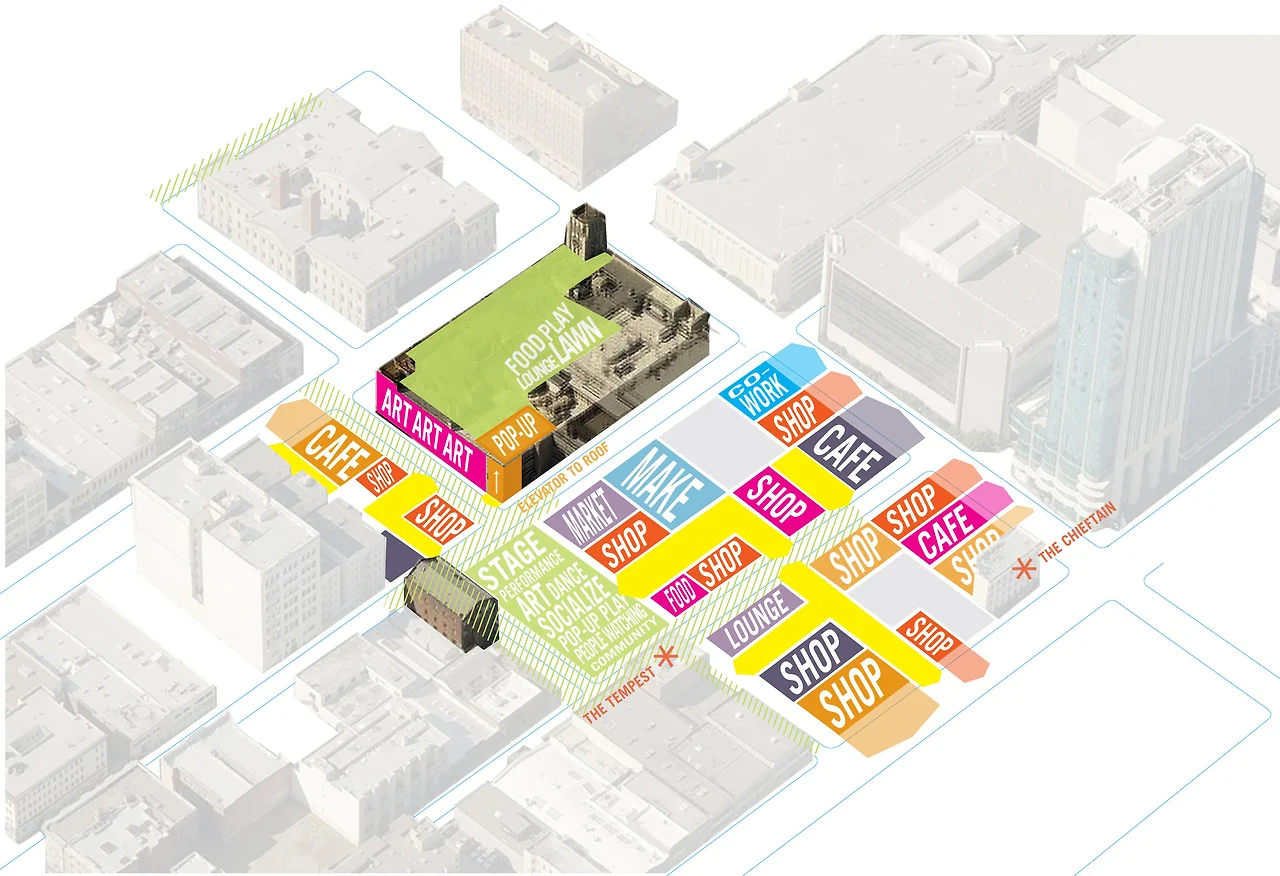디벨로퍼 Brookfield Properties와 Hearst Corporation은 대상지 내에 존재하는 Dempster Printing Building(1907-,인쇄소), Camelline(1923-,화장품 제조), Chronicle(1920-,신문사) 건물을 보존하여 지역의 분위기를 그대로 유지하며 옥상에는 오픈스페이스 건물내에는 코워킹 스페이스, 스타트업, 아트사업관련 등 지역 커뮤니티에 맞는 다양한 프로그램을 계획했습니다.