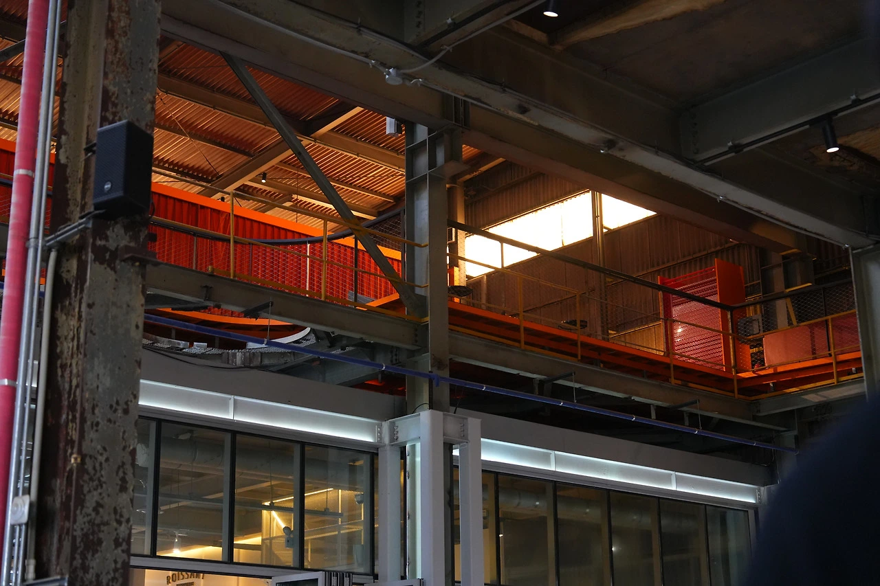 계단을 올라 3층에 올라오면 공간의 분위기가 바뀐다. 호이스트 홀은 보이드 홀의 공간보다 더 높은 천정고 12m의 공간으로, 더 밝고 개방적이다. 창문을 통해 빛이 들어오고, 베이커리 카페의 객석이 공간을 채운다. 보이드 홀의 어둡고 묵직한 무게감과는 다른 분위기이다. 하지만 천장을 올려다보면 공장 시절의 구조체가 그대로 노출되어 있고, 호이스트의 레일이 머리 위를 가로지른다. 카페의 온기와 공장의 뼈대가 같은 공간 안에 겹쳐있다.