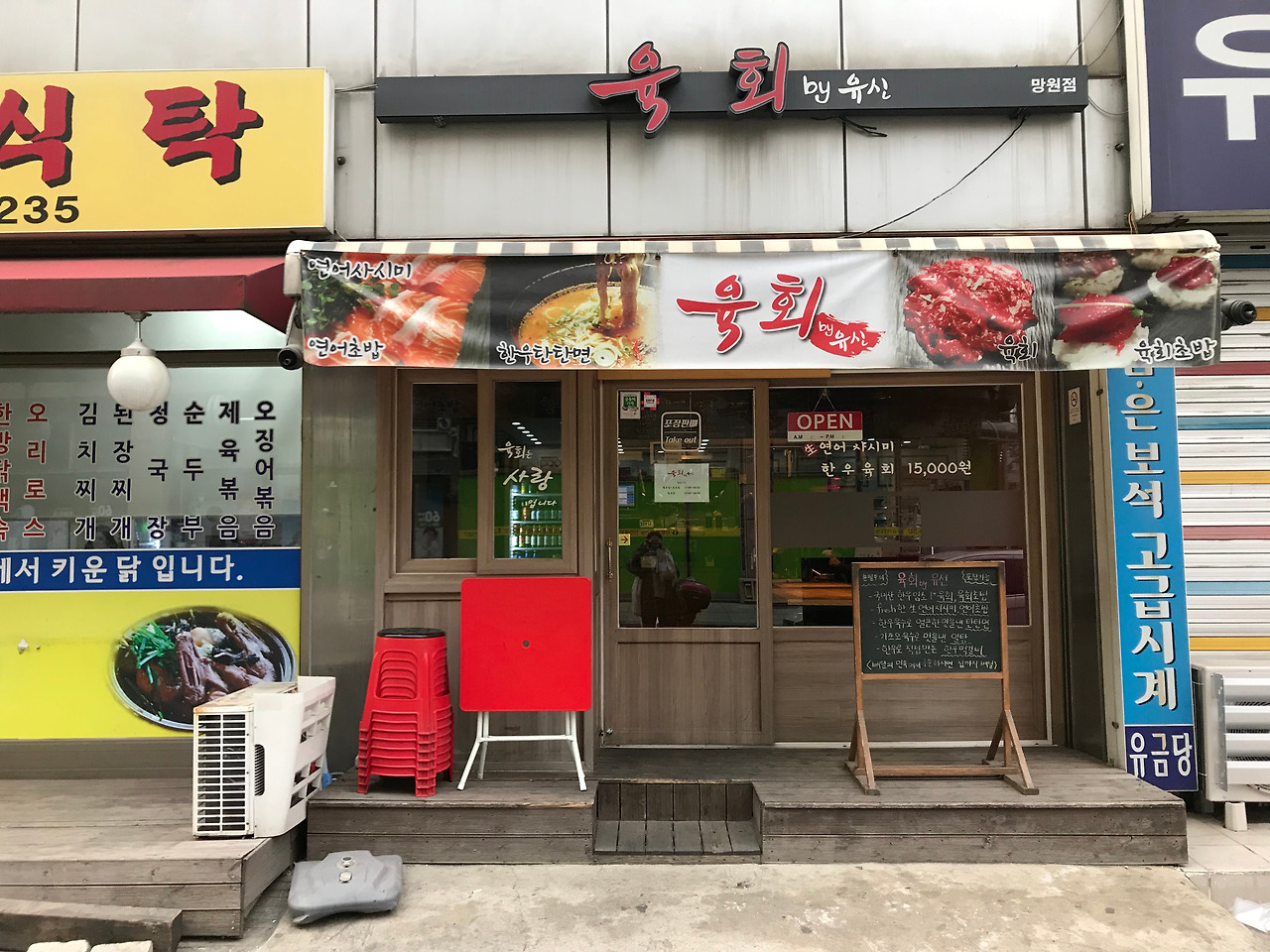 주변의 다른 간판들과 달리 글씨로 '육회'라고 쓰여 있는 것부터 남달랐다. 육회, 육회 초밥, 연어 사시미, 연어초밥, 탄탄면, 한우 떡갈비가 이곳의 메뉴 전부이다. 늘 가볍게 먹을 심산으로 방문하지만 육회를 먹고 탄탄면을 먹은 후 초밥으로 마무리한다. 그렇게 배 터지게 먹어도 5만 원도 안 나오는 마법의 맛집이다.