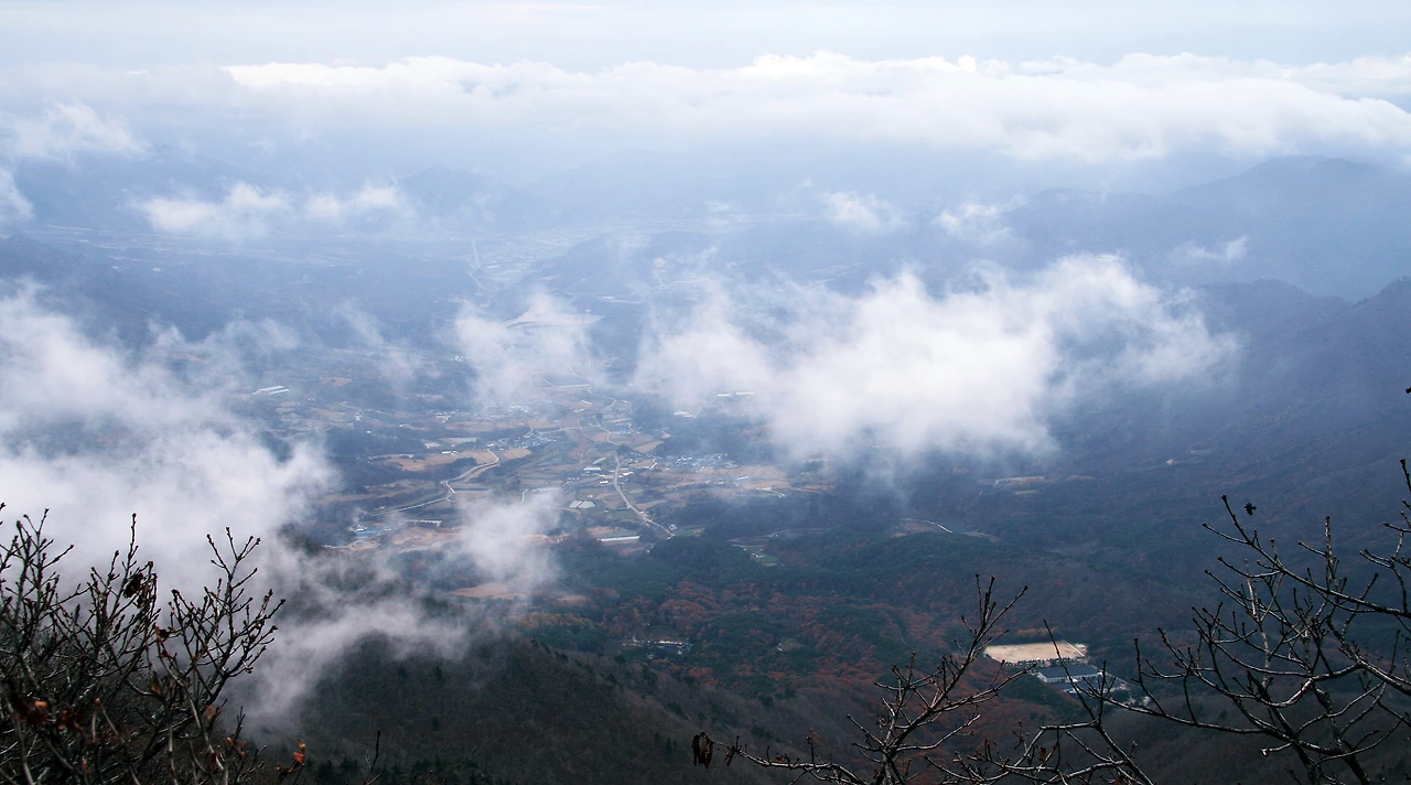 남덕유산 정상으로 오르는 능선 아래 마을이 운무에 가려져 있다.