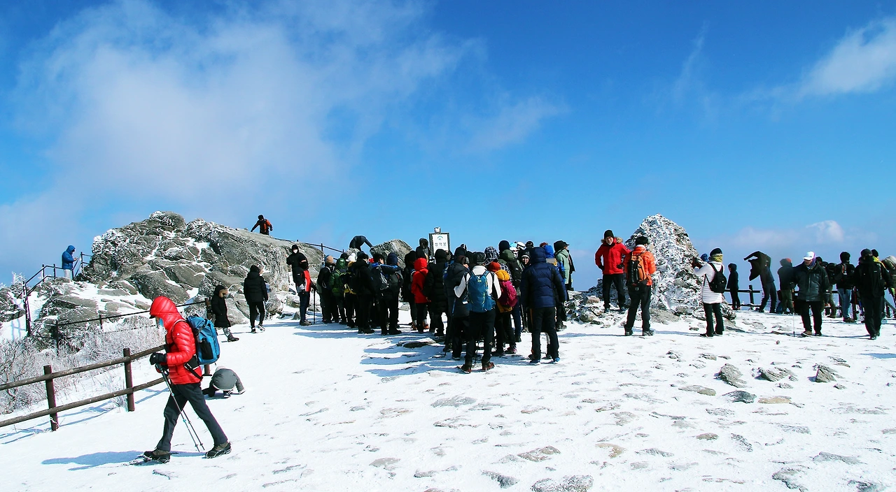 향적봉 앞에 인증 샷을 남기려는 산객들이 줄을 서있다.