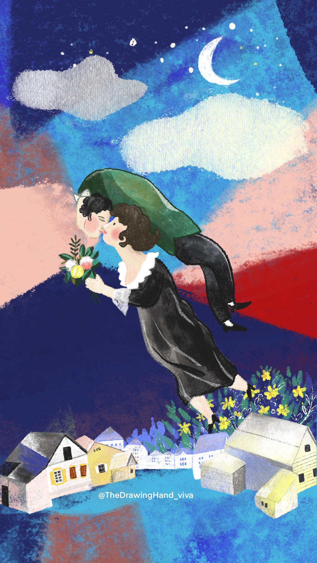마냥 동화처럼 꿈처럼 보이는 샤갈의 그림 속에는 그가 평생을 사랑했던 모든 것들이 반복적으로 등장했다. 샤갈은 사랑과 그리움의 대상 그리고 그의 감정을 함께 그림으로 그렸다. 모든 것은 사실에 기반한 실제의 것이었지만, 결과로 나타난 그림은 그저 현실성 없는 꿈속의 한 장면 같이 보인다. 어쩌면 실제 샤갈이 꾼 꿈의 한 장면이었을지도 모른다. 먼저 세상을 떠난 아내 벨라를 그리워하다가 꿈에서 만나 격한 포옹을 나누고 손을 맞잡고 그리운 고향 하늘을 날아다니는 꿈이었을까?