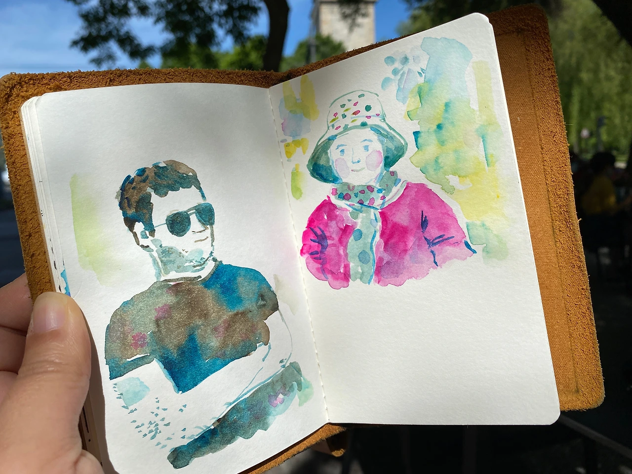 카페에서 커피를 두 잔이나 마셨다. 스페인 카페에서 마시는 커피는 잔도 작고 양도 적어서 한 잔이 마치 한 모금 같다. 코르타도 cortado를 얼음이 든 잔에 털어 넣어서 시원하게 한 모금 마시고 핸드백에서 미니 드로잉북을 꺼냈다. 4구짜리 알약통 팔레트도 꺼내어 스케치 없이 물붓으로 그림을 그렸다. 기본색은 하나도 없고 좋아하는 색만 넣어서 만든 팔레트다. 그림을 가볍게 그리고 싶은 날에는 이만하면 충분하다. 쓰고 싶은 색을 다 만들기는 좀 부족하지만 없으면 없는 대로 이렇게 저렇게 색을 섞어 가며 그리면 되니까. 팔레트가 작으니 색을 섞을 곳도 따로 없다. 그래도 괜찮다. 색을 바꿀 때 붓에서 섞이기도 하고 종이 위에서 서로에게 스민다. 붓으로 그림을 그리면 넓은 면으로 표현할 때는 편하지만 선이나 작은 문양을 그릴 때는 힘들다. 나와 함께 한 테이블에 앉아 있는 우리 가족과 느리게 대화를 나누며 그림도 느리게 그린다.