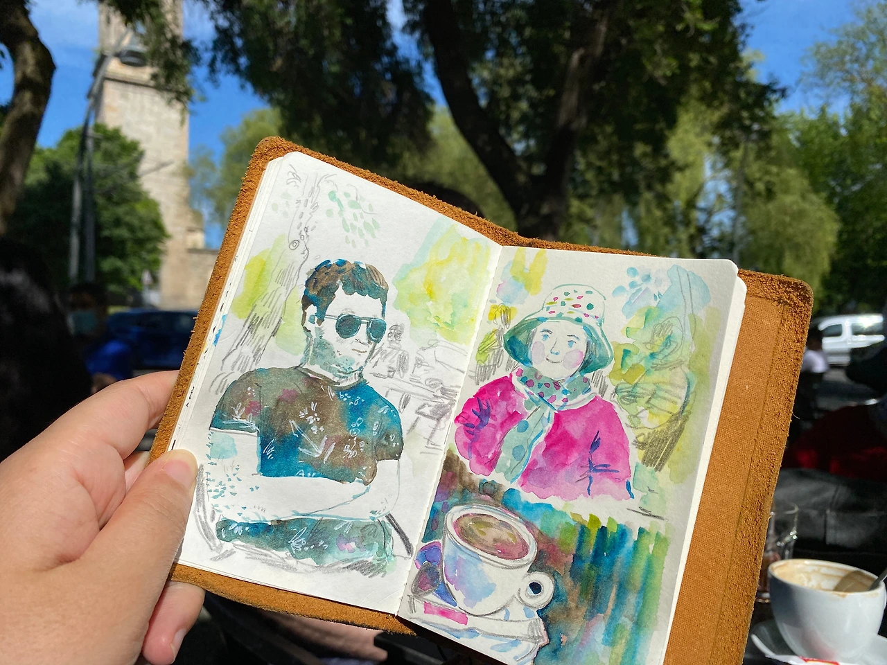 두 번째 카페 콘 레체 cafe con leche를 마시기 전에 필통에서 연필을 꺼냈다. 언젠가 사은품 혹은 선물로 받은 파버 카스텔 연필. 사실 샤프인데 품은 연필심도 1.4mm나 되고 어지간한 펜보다 통통한 외형이라 샤프라고 부르기가 어렵다. 마지막에 등장한 연필은 스케치용이 아니라 흑연의 색과 결을 더해주는 역할을 한다. 이 시간에는 물붓으로만 표현하기 힘들었던 가는 선도 표현해주고 배경을 흐릿하게 그려주고 싶어서 꺼냈다. 특별히 배경까지 그릴 생각은 없었는데 우리가 커피를 마시며 이야기하는 동안 주변 테이블에 사람이 많아져서 슬쩍 곁눈질로 빠르게 그려 넣었다. 대충 그린 주변 사람들은 그림에는 제대로 표현되지 않았지만 나는 내가 어떤 사람을 그렸는지 다 기억한다. 혼자서 커피 한잔을 두고 앉아 있던 모자와 선글라스에 가죽재킷을 입은 아저씨. 빨간색, 남색, 흰색 줄무늬 폴로 티셔츠를 입고 파란 마스크와 안경을 쓴 아저씨. 그리고 가장 멀리 있던 테이블에는 두 사람이 앉아 있었는데 그중에서 짧은 반바지에 민소매 티를 입은 여자만 그렸다. 여자 맞은편에 앉아있던 사람은 자리가 부족해서 그리지 않았다. 계획 없이 그리다 보니 오른쪽 아래가 텅 비었다. 내 모습을 그려 넣으려다가 내 앞에 놓인 카페 콘 레체 커피잔으로 대신했다. 손잡이가 동그란 특징이 있는 평범한 잔이다.