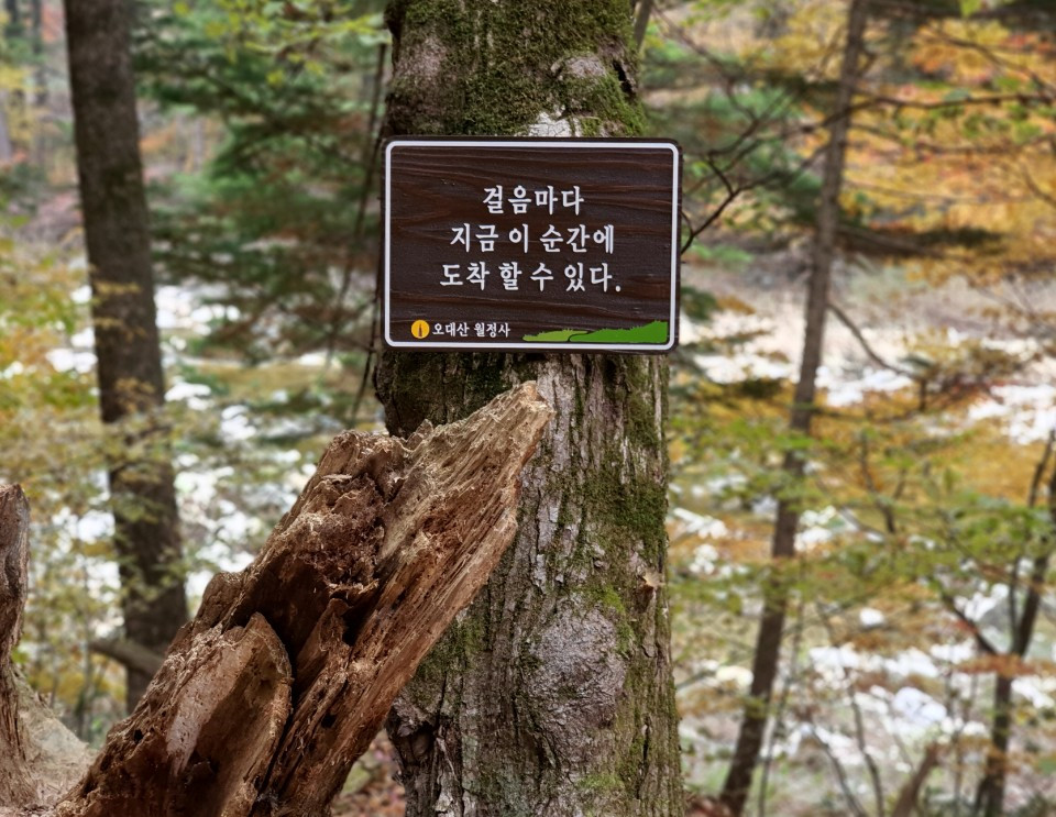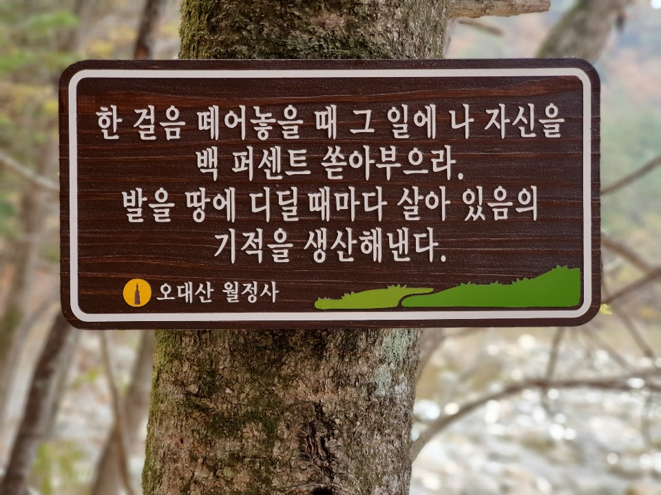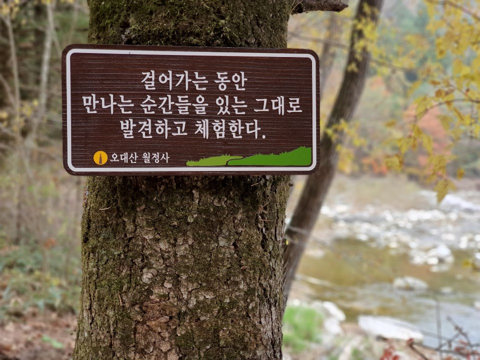 월정사를 향해서 쭈욱 뻗은 전나무 숲길을 걸을 때, 중간중간 마음을 울리는 글귀들을 만난다.
