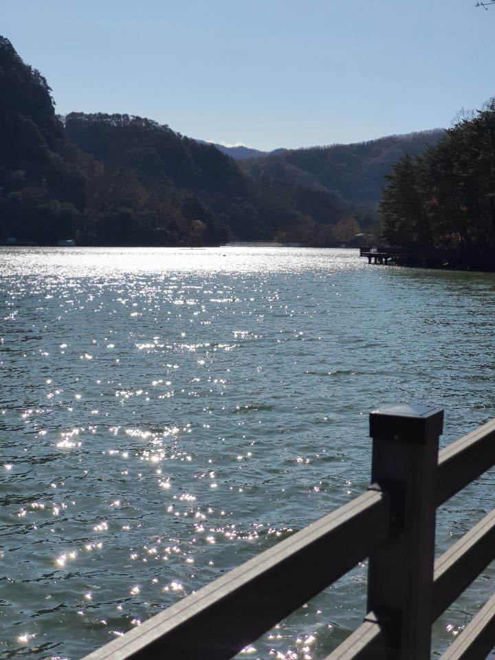 산정호수를 따라 걷다가 호수 위의 윤슬을 보았어요. 햇살에 반짝이는 물결, 윤슬.