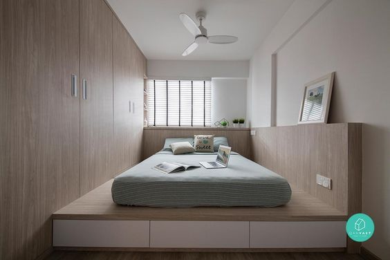 예를 들어 도심에서 갖기 힘든 멋진 뷰가 거실 쪽이 아닌 반대쪽에 있는 경우가 있다. 주방은 창이 너무 작고 작은방 하나는 뒤로 다용도실이 있어서 밖을 보기 어렵고 밖을 내다보기 좋은, 자녀가 사용하는 입구방은 발코니가 없이 외벽과 만나있어 창이 반창이라고 해보자. 옷장과 책상, 책장, 침대를 벽을 둘러 배치하면 딱히 여유 공간도 없다. 이 경우 천장 높이를 많이 올릴 수 있다면 좋은데 창가 쪽 바닥 단을 80cm~1m 정도 올리고 하부를 옷장으로 사용한다. 윗 쪽에는 매트리스를 올려 침실 공간으로 사용한다. 벽 한쪽으로 서랍형 계단을 만들어 침대로 올라갈 수 있게 만들면 창가 쪽 작은 공간을 활용해 옷장 수납공간과 침실 공간이 해결되고 게다가 벽에서 벽까지 이어진 가로로 긴 창을 통해 멋진 뷰를 앉아서 감상할 수 있게 된다.