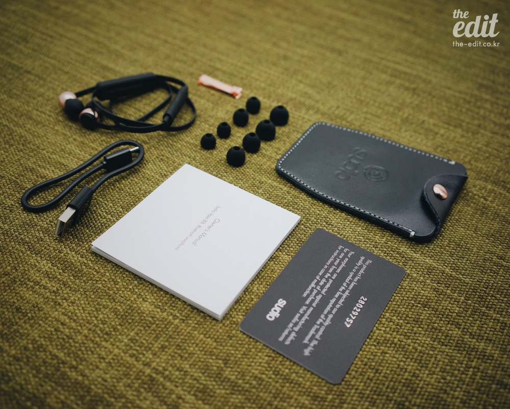 아름다운 구성이다. 특히 이어폰을 가지고 다닐 수 있는 가죽 파우치가 고급스럽다. 이어폰과 깔맞춤한 로즈골드 컬러의 메탈 클립도 보인다. 북유럽 청년들이 여자의 마음을 아네. 우리는 이런 작은 걸로 감동하는 법이지, 암.