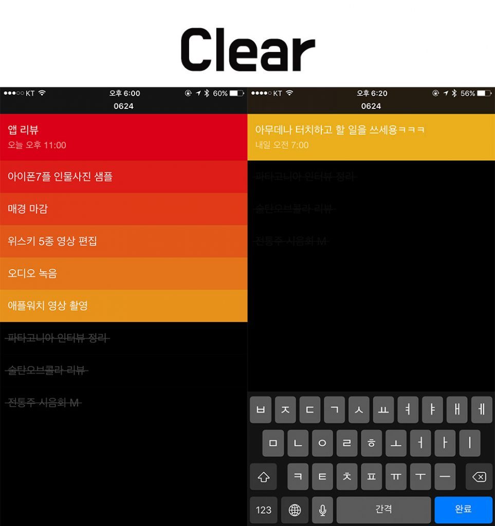 에디터M은 이 앱을 쓰더라. 가장 유명한 체크 리스트 앱 중 하나인 <Clear>다. 심플한 앱 디자인과 어린아이도 적응할 수 있는 직관적인 인터페이스가 인상적이다. 너무나 간단해서 설명할 것도 없다. 화면을 아래로 가볍게 당겨서 새로운 항목을 만들면 추가된다. 항목을 만들 때 원하는 날짜와 시간에 알림 기능을 추가할 수 있다. 오른쪽에서 왼쪽으로 스와이프하면 삭제, 왼쪽에서 오른쪽으로 스와이프하면 완료. 항목을 추가할 때마다 컬러 그라데이션이 연출되는 것이 아름답다. 가장 쉽고 간단하게 해야 할 일 목록을 만들고 싶다면 이 앱을 추천한다. 개인적으로 내가 쓰기엔 기능이 너무 단순해서 몇 가지 아쉬운 점이 보였다.