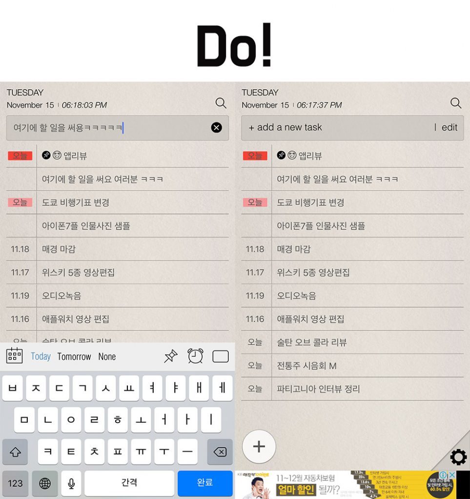 앱마다 장단점이 있었지만, 결론적으로 내가 선택한 건 이 앱이다. 이름도 깔쌈한 <Do!>. 목록에 새로운 ‘할 일(task)’을 추가할 때마다 날짜를 선택할 수 있다. 달력에서 직접 선택할 수도 있고, 오늘이나 내일 할 일로 설정할 수도 있으며, 날짜 제한 없이 추가하는 것도 가능하다. 다 끝낸 일은 해당 항목 위에 손가락을 올리고 가볍게 ‘더블탭’하면 짝대기(?)가 그어진다.