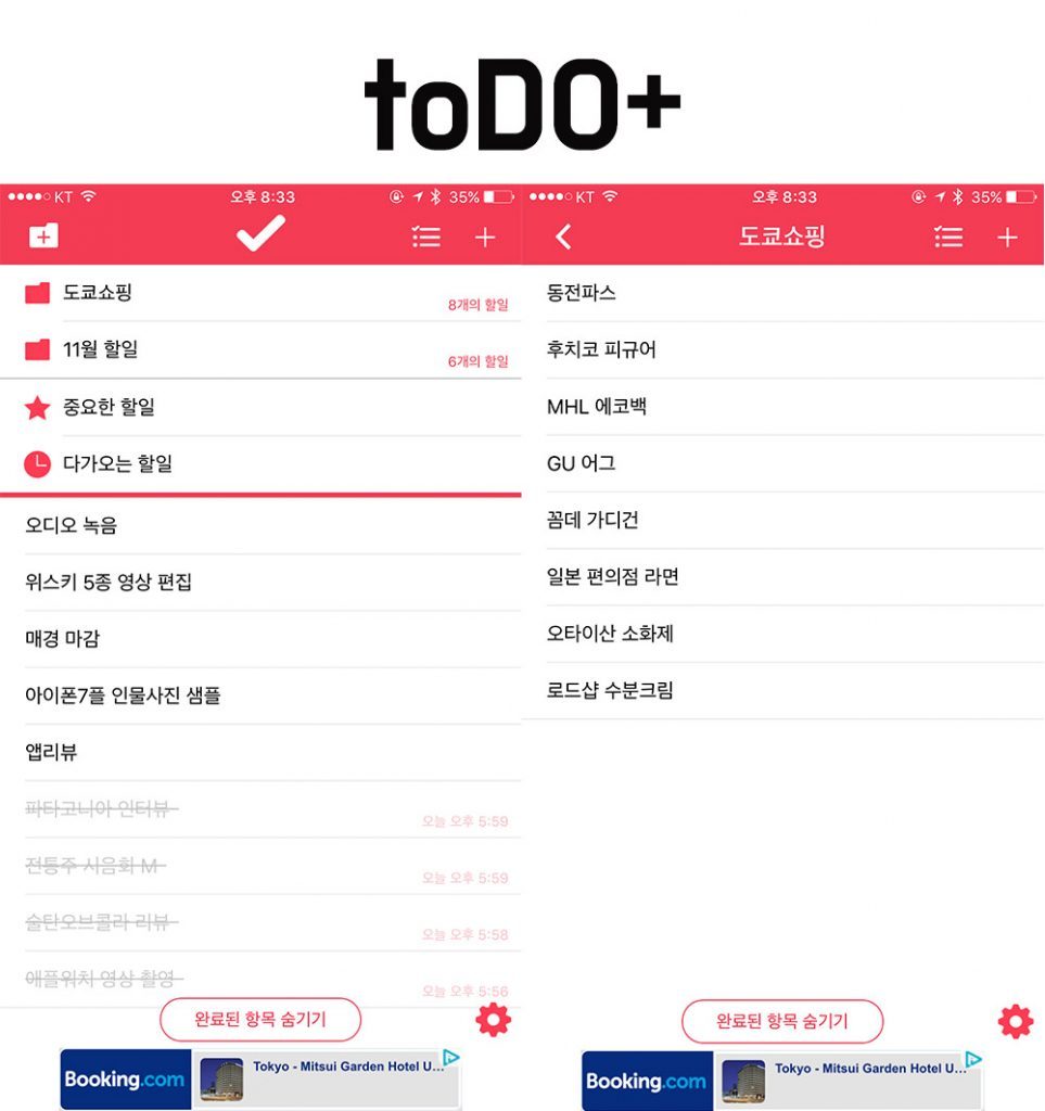두 번째로 소개할 앱<toDo+>. 폴더 별로 체크 리스트를 만들 수 있다는 점이 특징이다. 나는 체크 리스트를 한 화면에 쭉 펼쳐두고 하나씩 지우며 사용하는 걸 더 선호하지만, 때에 따라선 폴더 별로 정리하는 게 더 편리하니까. 이 앱을 테스트할 때는 ‘할 것’ 리스트와 함께 ‘살 것’ 리스트도 만들었다. 업무용 리스트와 개인적 리스트가 섞여 있으면 거슬릴 때가 있는데, 폴더를 구분하면 한결 깔끔하다.