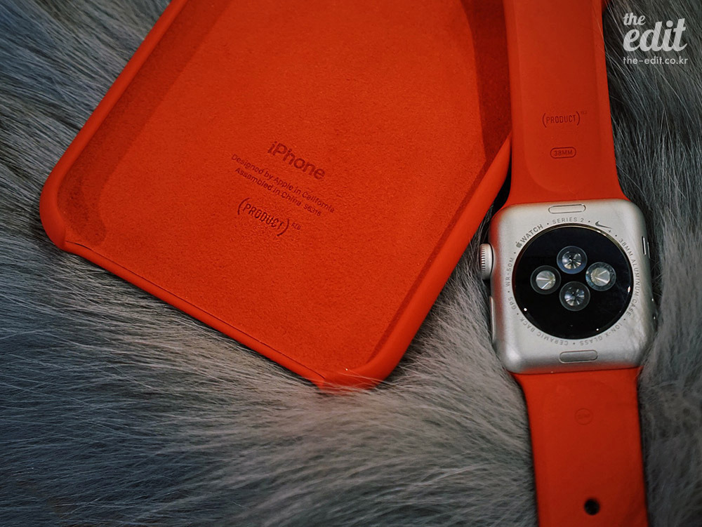 실물은 애플워치 밴드와 아이폰 케이스의 레드 컬러가 미묘하게 다르다. 폰 케이스 쪽이 훨씬 쨍하고 화사한 다홍빛 컬러.