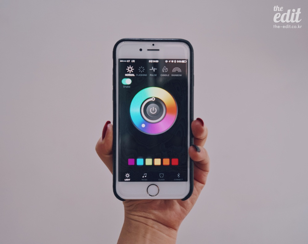 오라벌브를 제대로 사용하기 위해서는 앱스토어나 플레이스토어를 통해 ‘Aurabulb’ 앱을 다운로드해야한다. 어렵지 않다. 블루투스 4.0을 지원하기 때문에 앱을 실행하자마자 척하고 빠르게 붙는다. 앱에서 직관적으로 원하는 색상을 고를 수 있다. 1,600만 가지의 색상 중 마음 내키는 대로 골라보자.