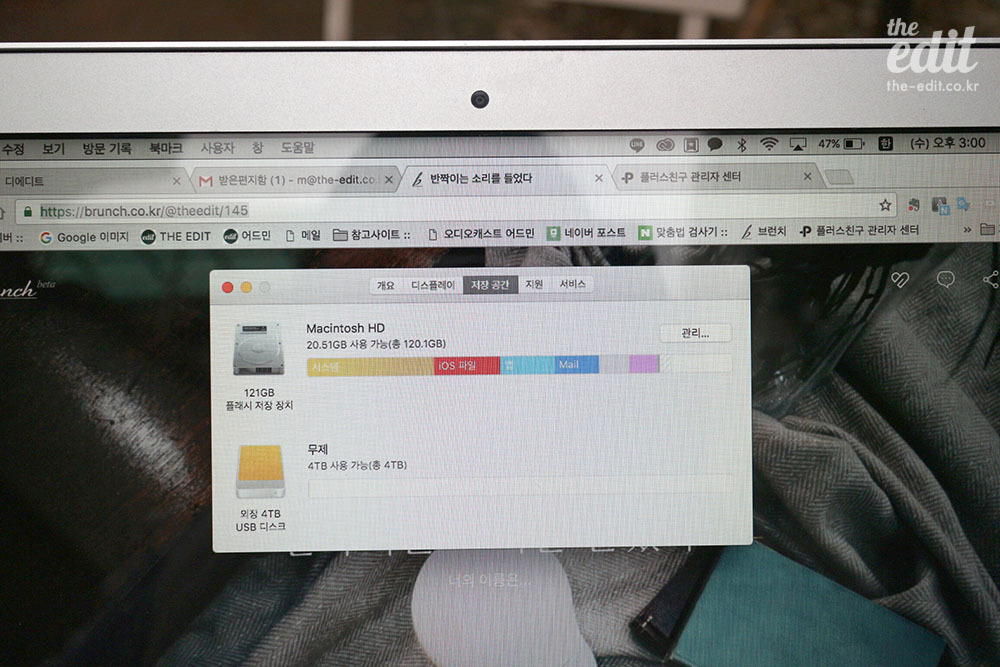 촬영할 때는 에디터M의 맥북 에어에 연결했었는데, 아니 세상에 이럴수가. 512GB가 비좁다고 투정하던 내가 사치스럽게 여겨질 정도다. 에디터M의 맥북에 사용 가능한 공간은 고작 20GB. 늘 숨이 헐떡거리는 상태다. 하나를 저장하려면 하나를 지워야 한다고. 내가 얌체처럼 내 것만 마련했는데, 에디터M이야 말로 외장 하드가 필요할 것 같다. 연말 선물로 사줘야하나. M, 무슨 색을 원하니? 선물은 원래 후끈한 마음을 담아 빨간 색이 제일 좋은데 말이지. 아마 올해 마지막 선물이 되겠네.