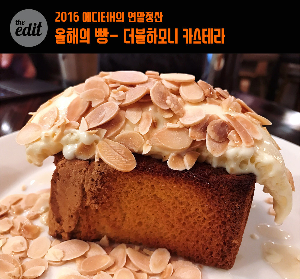 나는 탄수화물을 사랑한다. 치킨이나 삼겹살보다는 밥과 빵에 열광한다. 그런 내가 뽑은 2016년 최고의 빵은 합정역 인근 카페 ‘더블하모니’에서 먹은 카스테라. 몇 가지 베이커리 메뉴를 판매하는데 모두 주문 후에 즉석에서 바로 구워준다. 이 카스테라는 우리가 보통 먹던 그것과는 아주 다르다. 파운드 케이크와 카스테라의 중간 정도? 아니 설명할 길이 없다. 겉은 바삭하고 속은 촉촉하다. 달콤하지만 질리지 않는다. 빵 위에 지붕처럼 얹어진 것은 바닐라 아이스크림과 아몬드 슬라이스다. 저 아이스크림은 이상하리만치 쫀쫀하고 바닐라 특유의 풍미가 강하다. 따뜻한 빵에 차가운 아이스크림을 얹어서 먹는데도 지저분하게 녹아 흐르지 않는 것도 특징. 나만 알고 싶은 맛이지만 특별히 공유한다. 참고로 커피는 내 스타일은 아니었다.