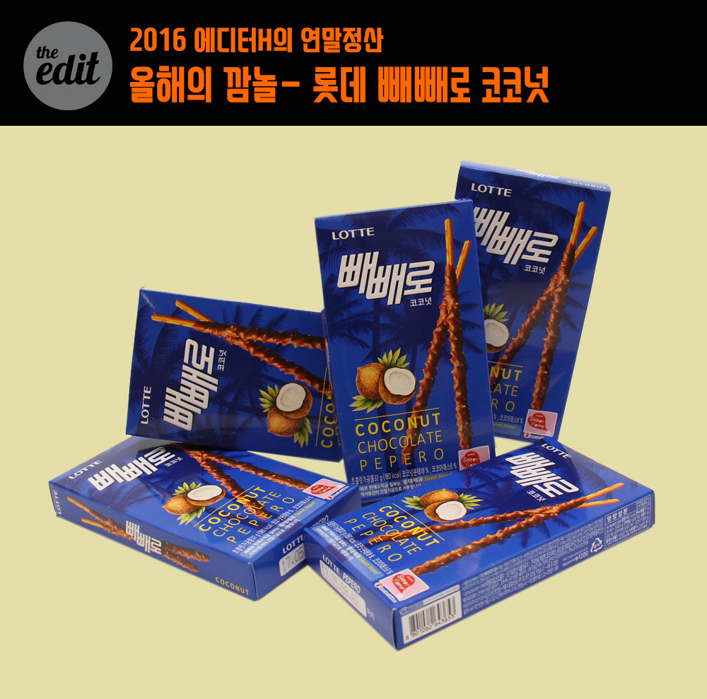 잠깐 분위기 전환을 해보자. 그간 기회가 없었는데, 이제라도 이 과자를 소개할 수 있어서 기쁘다. 지난 11월 11일. 언제나 그러했듯 나는 일을 하고 있었다. 편의점에 들렀는데 빼빼로 투성이었다. 오늘이 그날이구나 싶어서 나에게 빼빼로를 선물했다. 코코넛 맛이 보이길래 아무 생각 없이 샀는데, 어머어머, 뭔데 이렇게 맛있어. 빼빼로 주제에 고급스러운 풍미로 혀를 유혹한다. 인공적인 코코넛 향이 초콜릿에 촘촘히 스며 ‘뭔가 비싼 맛’을 만들어내더라. 보이면 무조건 먹어보시길. 근데 잘 안 보인다.