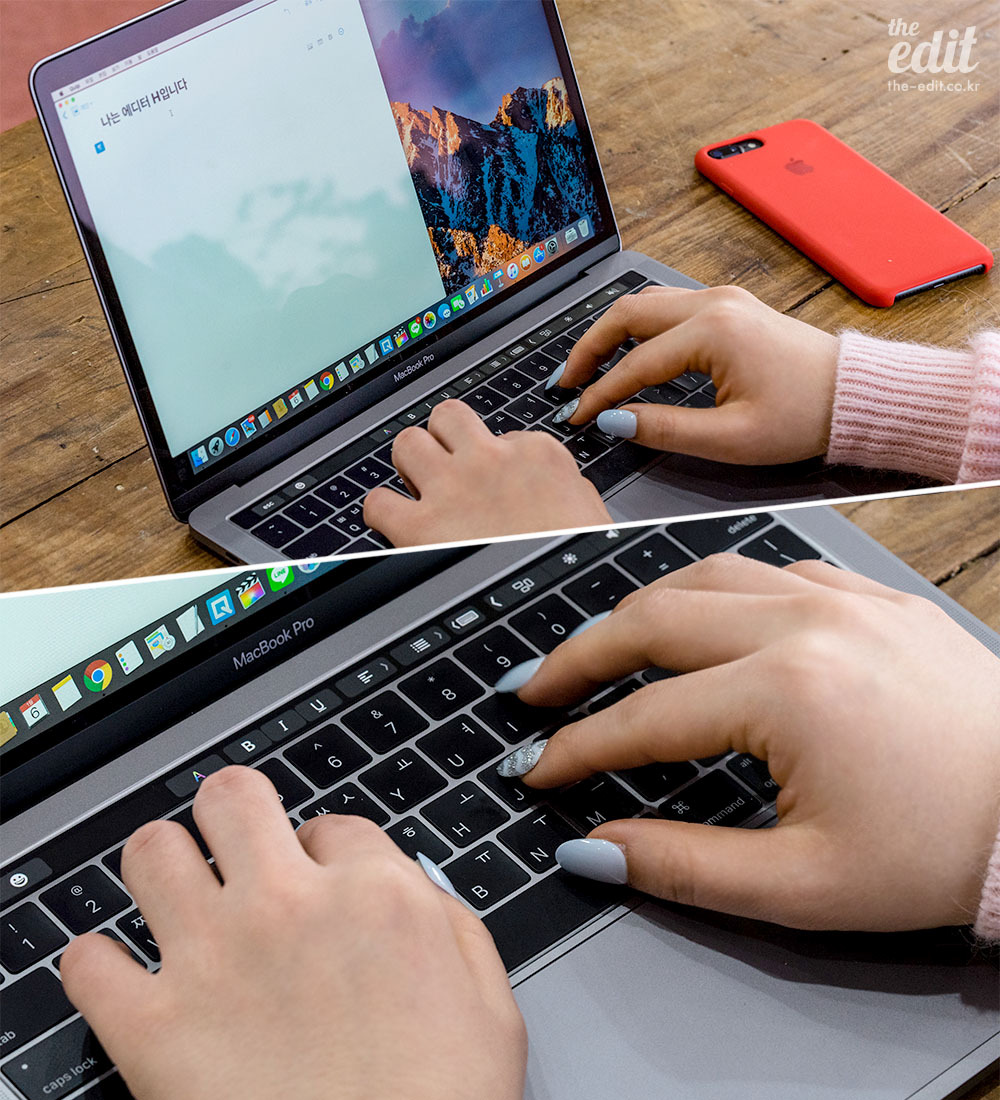 애플은 12인치 맥북의 1.31cm라는 비현실적인 두께를 위해 ‘나비식 메커니즘’을 적용했다. 키의 높이가 아주 낮고, 안정적으로 반응하는 키보드다. 최소한의 높이로 최대한의 키감을 제공하는 게 나비식 메커니즘의 목적이다. 새로운 맥북 프로에도 나비식 키보드가 들어갔다. 눌리는 깊이는 기존과 같지만, 훨씬 요란하게 반응한다. 더 많이 눌린 것 같은 착각을 불러 일으킨다. 손맛을 살리기 위해 ‘MSG’를 첨가한 모양인데, 꽤 경쾌하다. 내 취향엔 잘 맞는다. 다만 아주 소란스럽다. 한번 누를 때마다 “나 눌렸어요! 호잇!” 하면서 타다닥, 소리를 낸다. 도서관에선 비추, 스타벅스에선 추천.
