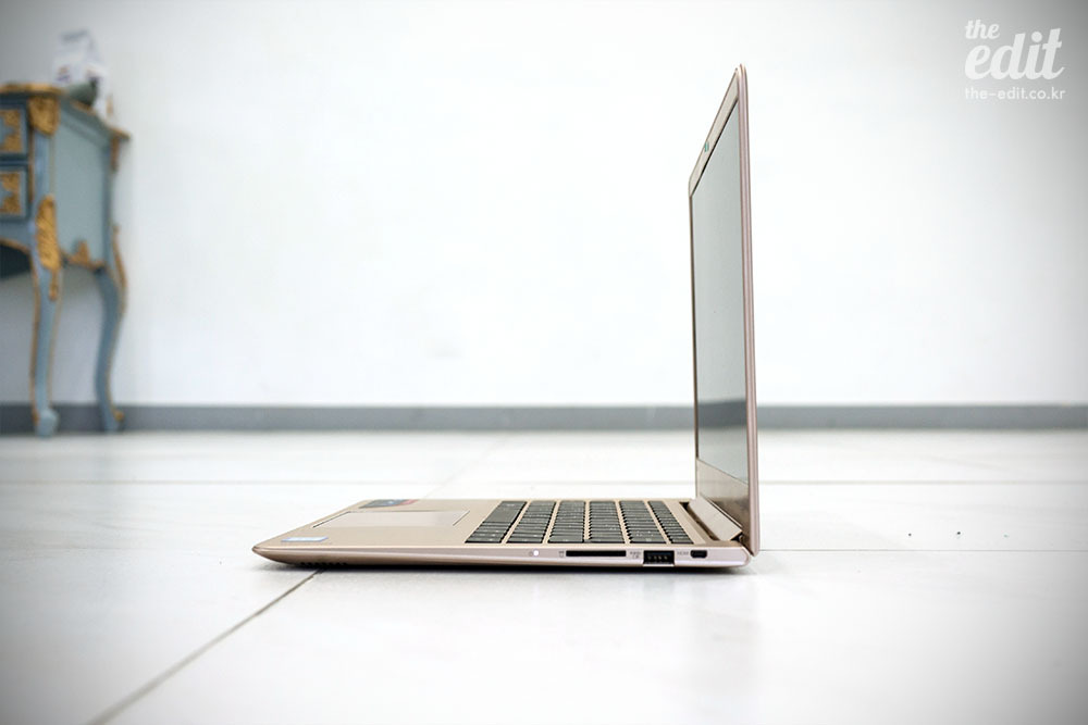 일단 휴대성과 디자인부터 체크해보자. 13.3인치의 디스플레이는 노트북에겐 가장 이상적인 화면 크기다. 개인적으로 15인치로 올라가면 매일 들고 다니기엔 조금 부담스럽다고 생각한다. 화면 크기에 비해선 덩치가 작다. 열어보면 이유를 알 수 있다. 베젤이 놀라울 만큼 얇다. 샴페인 골드 컬러는 무난하다. 개인적으론 조금 더 화사한 컬러여도 좋았을 것이라고 생각한다.
