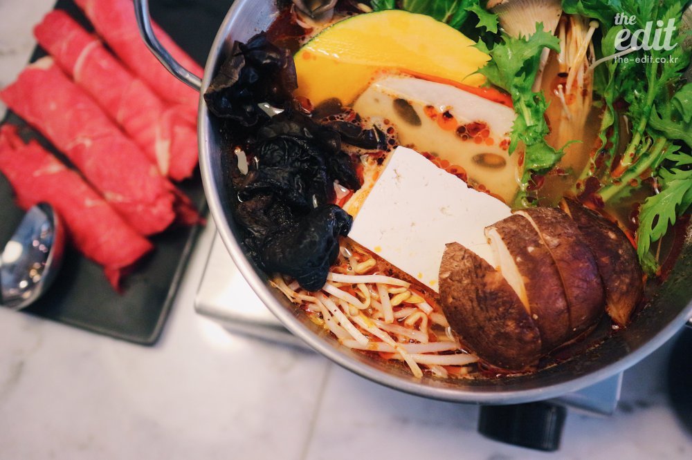 메인 메뉴는 마라 핫팟(훠궈). 하드코어 매니아인 내 입맛엔 아주 약간 싱거웠지만, 마라의 맛을 별로 즐기지 않는 에디터H는 만족스러워했다(물론 소스를 추가할 수 있다). 만약 마라가 거북한 사람이라면 된장과 두유 베이스의 핫팟도 있으니까 취향껏 골라 먹어보자. 보글보글 국물이 끓기 시작하면, 싱싱한 채소를 골라 먹고 고기(소와 양 중 선택할 수 있다)를 익혀서 입에 넣으면, 디스 이즈 헤븐.