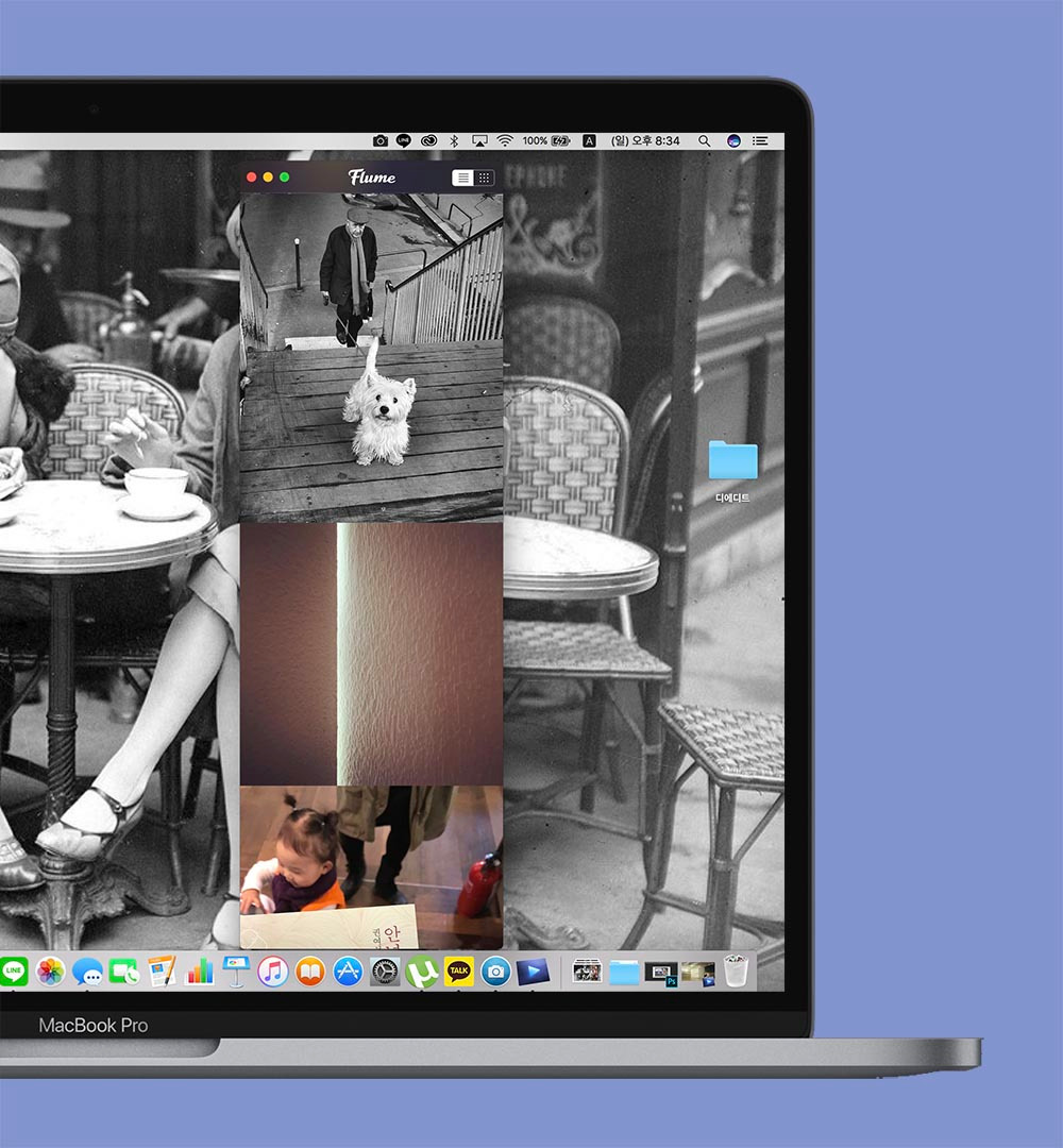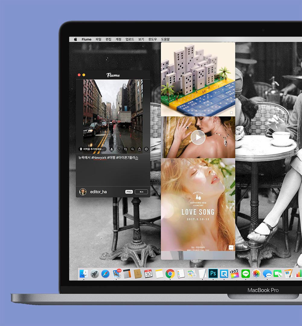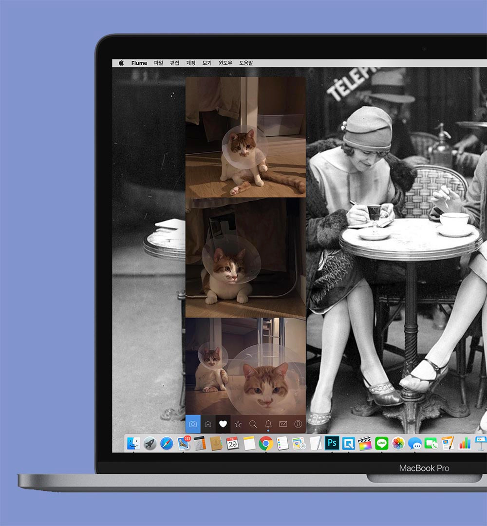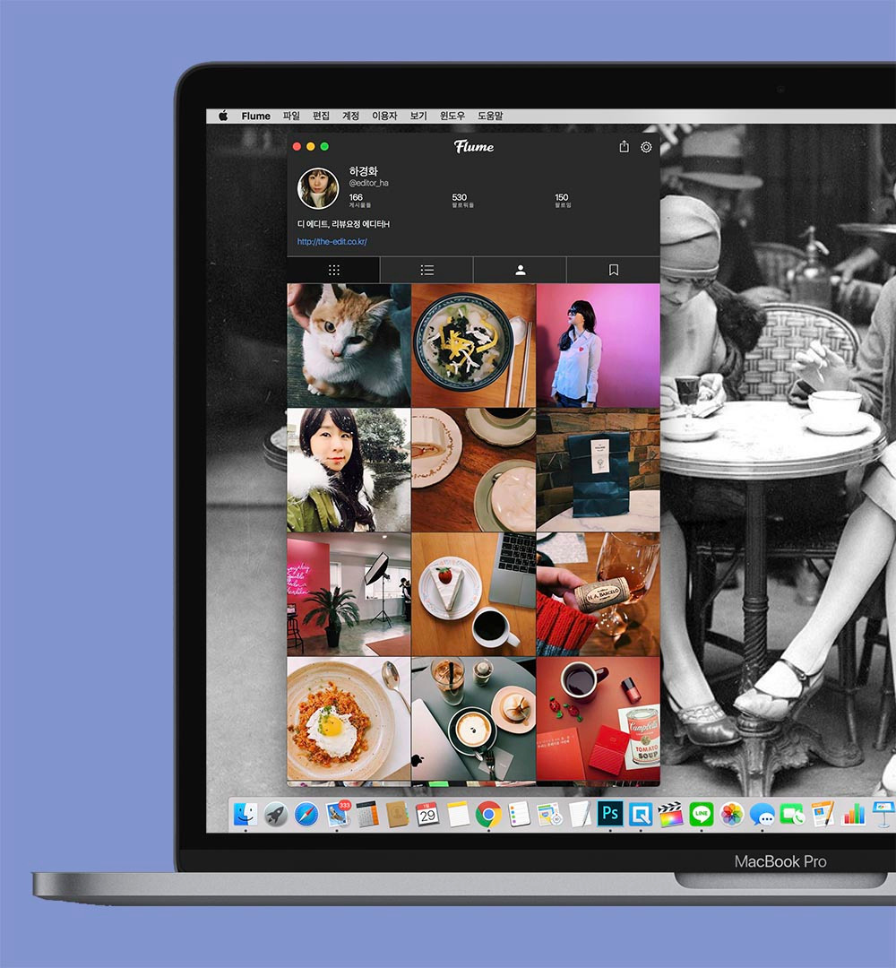 긴 미니창 형태로 팝업되는 flume 앱에서 본인 계정으로 로그인 하면, 피드에 있는 사진들을 리스트 형태로 보여준다. 깔끔하고 근사하다. 정렬은 세로 리스트형과 타일형 중 선택할 수 있다. 커서를 갖다 대기 전까지는 아무런 사족도 보이지 않는다. 클릭하면 게시물의 내용이나 댓글을 확인할 수 있고, 더블클릭하면 ‘좋아요~’를 시전할 수 있다. 영상은 피드에서 바로 플레이할 수 있다.