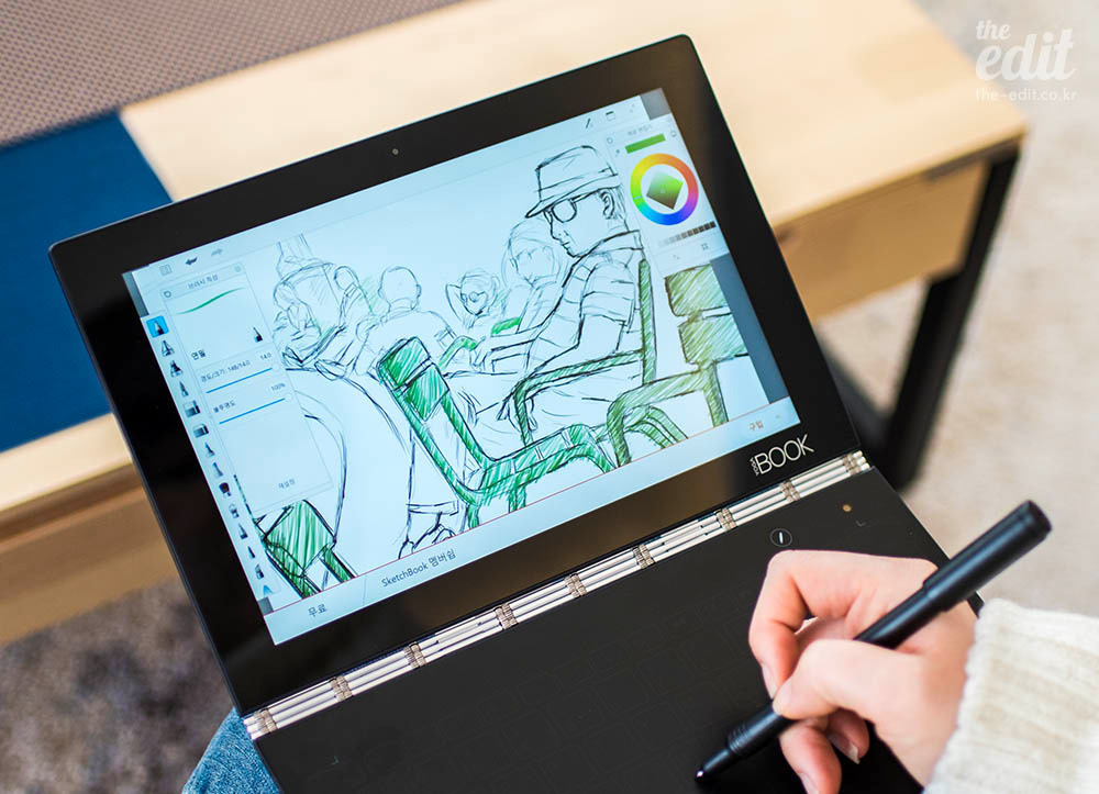 요가라는 이름에 걸맞은 유연함도 눈여겨 보자. 360도 회전 가능한 힌지는 견고하고 부드럽다. 그림을 그리거나 필기를 할 땐 180도로 쫙 펼치는 것이 편리하며, 적당한 각도로 맞추면 영상 감상용이 된다. 10.1인치의 화면은 드라마틱한 수준은 아니지만 혼자 영상 보기엔 꽤 괜찮은 크기다. 화면보다는 사운드가 의외로 훌륭한 편이기도 하고.