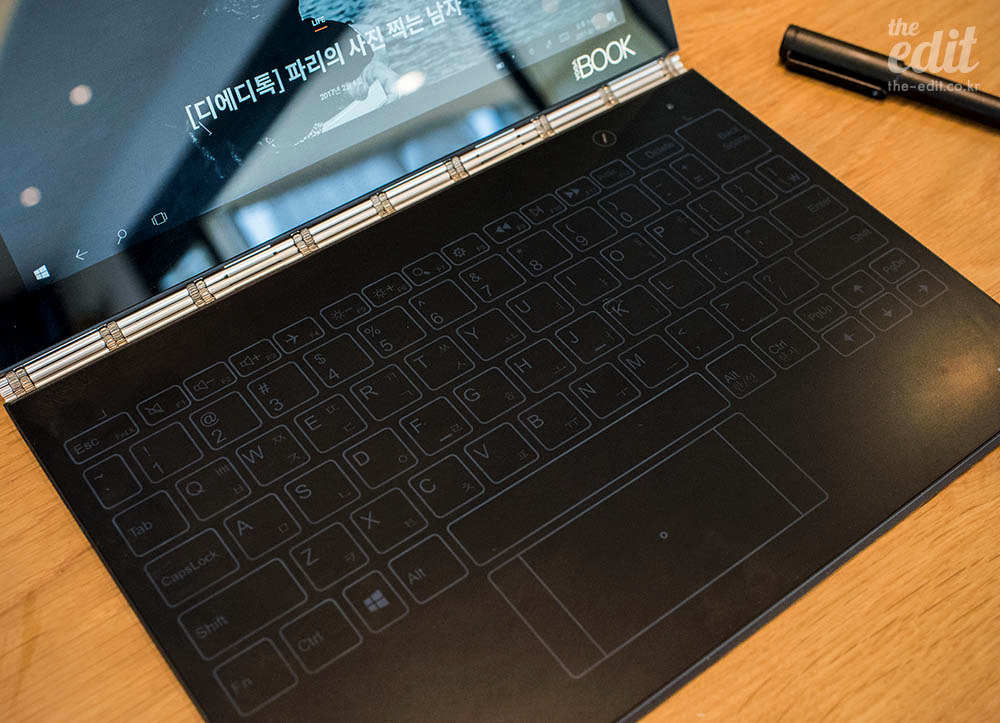 어떻게 이렇게 가벼운 거냐고? 이유야 여러가지가 있을 것이다. 무게는 여기저기서 덜어냈을 테니까. 그래도 가장 큰 이유는 물리적인 키보드가 없다는 것이다. 처음에 아무 정보 없이 이 제품을 보면 당황하게 된다. 노트북처럼 생겨서 열었는데, 반질반질 아무 것도 없는 까만 패드만 자리하고 있으니까. 키보드가 어디있나 해서 앞뒤로 손을 문질러보게 될 것이다. 요가북은 헤일로 키보드라는 가상 키보드를 사용한다.