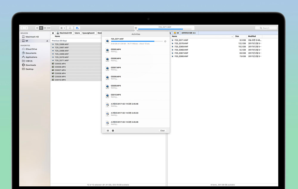 한쪽에는 이동할 파일이 있는 폴더를 열고, 한쪽에는 파일을 옮길 새 폴더를 만들어두면 된다. 원하는 파일이나 폴더를 선택해서 드래그 하면 끝. 바로 파일 이동 및 복사가 시작된다.
