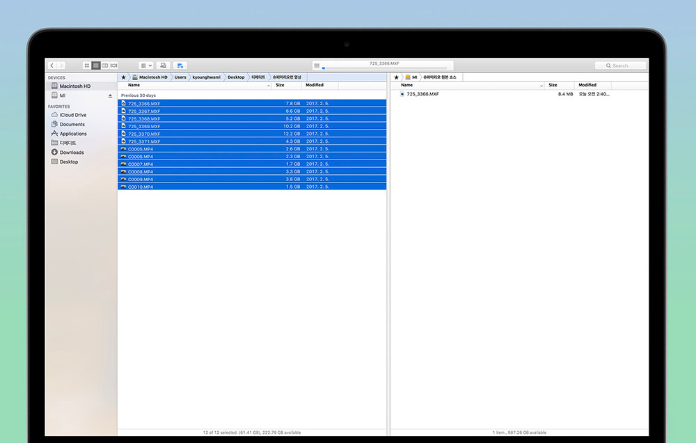 보이는 것처럼 한 창에서 듀얼 폴더를 띄울 수 있다. 번잡스럽게 창을 여러 개 띄울 필요 없이 깔끔하게 작업할 수 있다는 게 매력 포인트. 두 개의 폴더 중 상단 바가 하늘색으로 처리된 쪽이 현재 활성화된 폴더다. 조금 더 눈에 띄는 컬러로 표시해줘도 좋았을 텐데 맥 OS의 기본 UI에서 많이 튀어 보이지 않으려는 것 같다. 활성화된 상태에서 원하는 폴더를 선택하면 된다. 자주 쓰는 폴더를 즐겨찾기에 추가해 두면 편리하다.