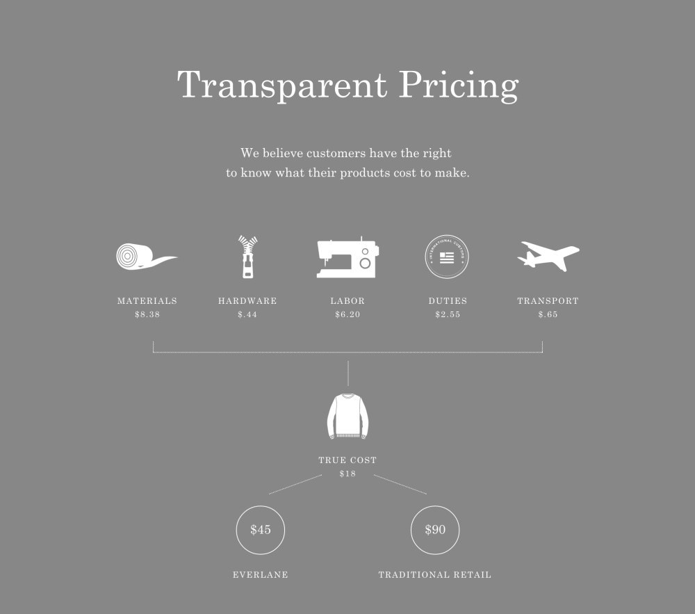 좀 더 스크롤을 내려보자. 에버레인의 모든 제품엔 그 아이템의 원가(true cost)가 명시되어 있다. 투명한 가격 정책으로 거품을 없애고, 인터넷 판매를 통해 유통 마진을 최소화한다는 정책이다. 이 역시 농산물 직거래 방식과 비슷하다.