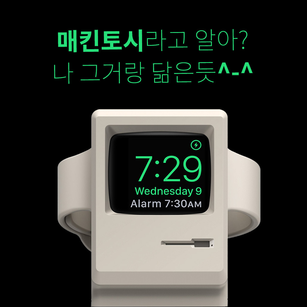 간만에 영접한 지름신인데 이대로 보내긴 아쉬웠던 모양. 세이코 시계로 시작된 시간여행은 날 엘라고에 떨궜다. 운명처럼 내 앞에 나타난 너라니. 엘라고의 W3 Stand는 타임지 커버에서 스티브 잡스가 안고 있는 매킨토시를 꼭 빼닮은 애플워치 충전독이다. 매킨토시가 35년을 달려 애플워치 충전독에 안착했다. 너 좀 귀여운 것 같아. 충전 중인 애플워치 화면과 어우러지면 꼭 도스(DOS) 화면처럼 보이는 리얼리티가 살아난다.