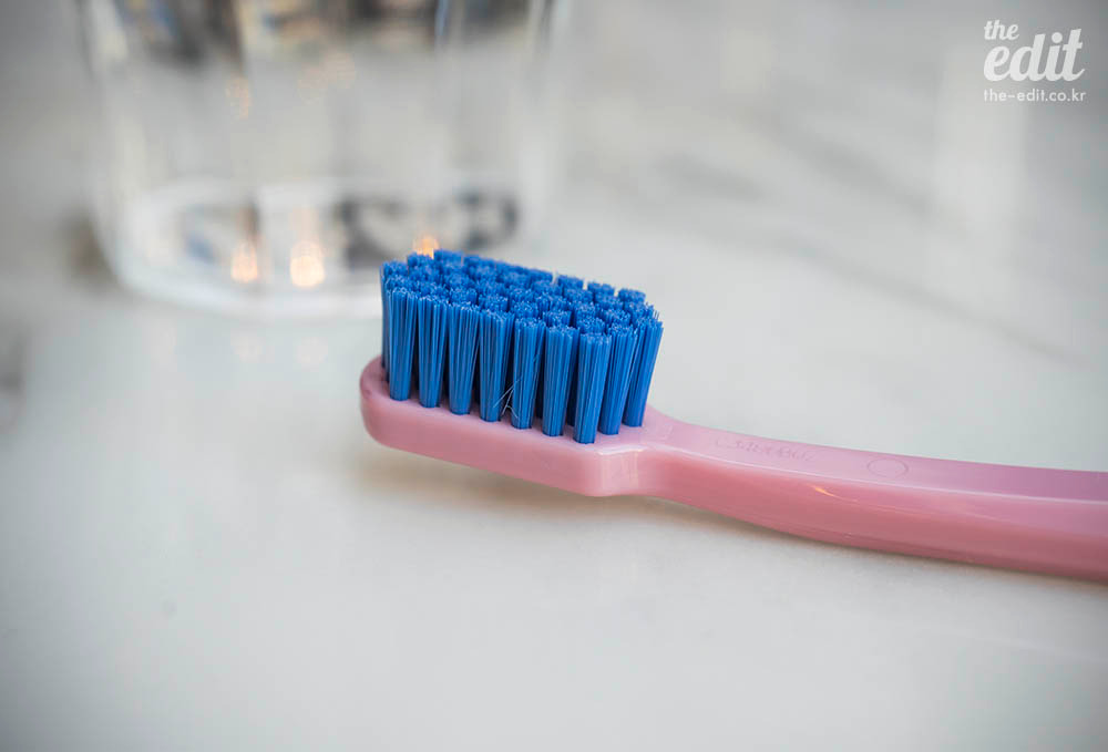이 칫솔은 소두다. 다른 칫솔의 3분의 2 정도 되는 크기인데, 이렇게 머리가 작아서 좋은 점은 칫솔이 잘 닿지 않는 어금니까지도 잘 닿을 수 있다. 촘촘하고 부드러운 칫솔모는 혀를 닦을 때 진가가 드러난다. 내 혀의 설태를 싹싹 긁어내는 기분.