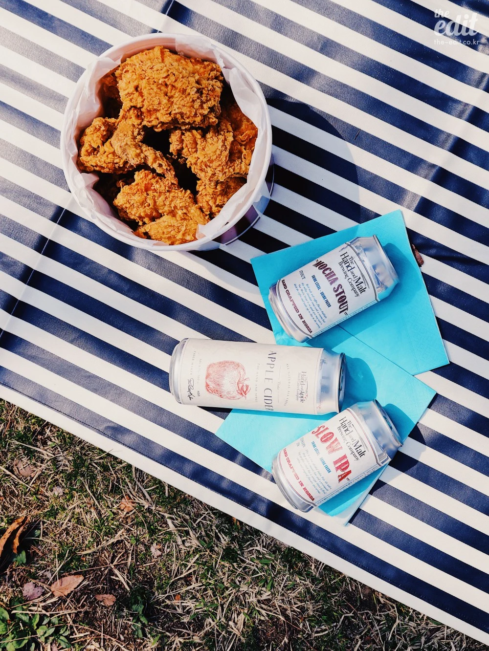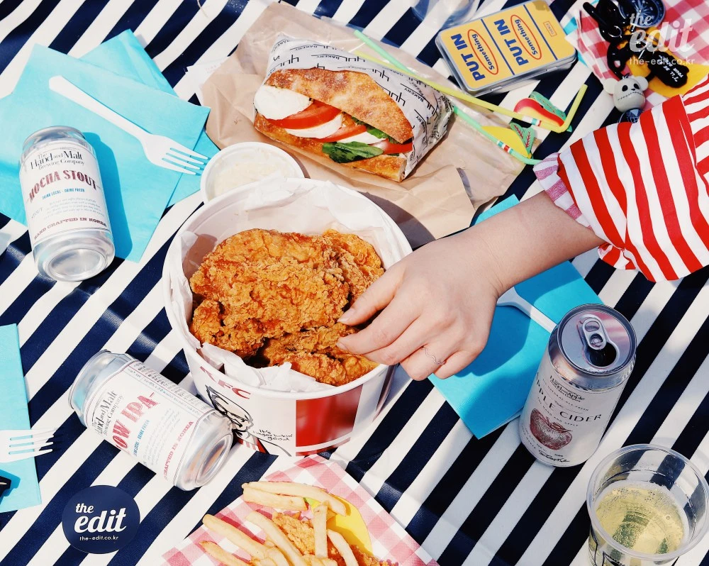 촬영을 가장한 피크닉. 적당히 준비하려고 했는데, 에디터H가 세상 진지한 얼굴로 말했다. “바보야, 피크닉의 핵심은 음식이야. 과하다 싶을 정도로 준비해야 하는거라고.” 그래서 치킨에 샌드위치 그리고 김밥까지 준비했다. 한(韓) 미(美) 가 만난 아주 조화로운 고칼로리 메뉴였지.