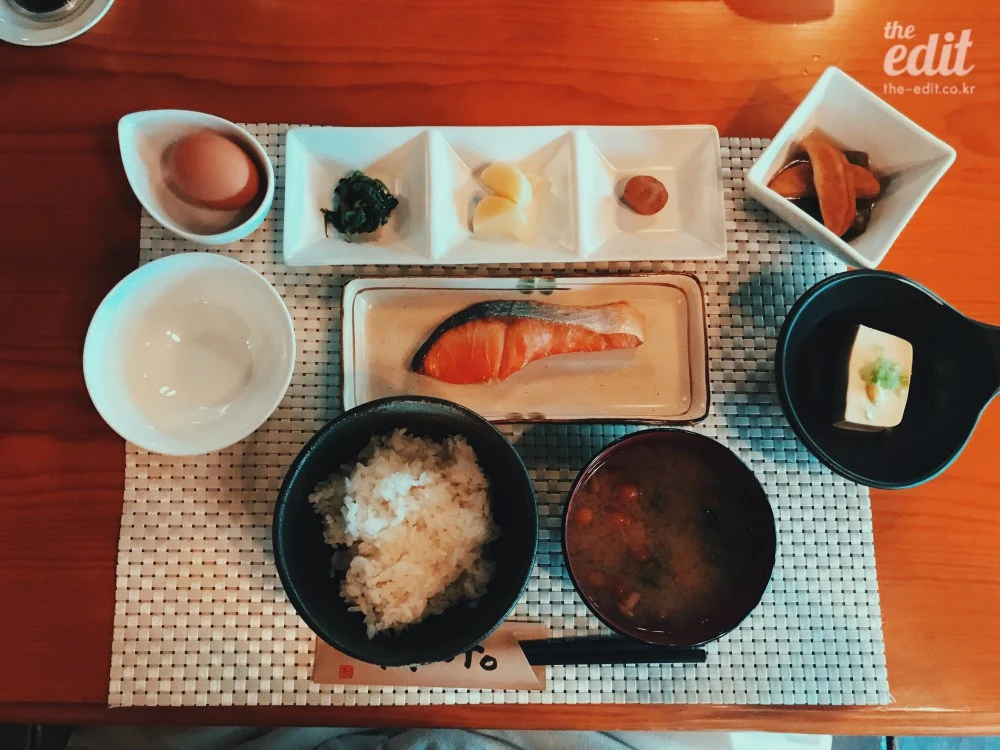우리가 절약한 돈으로 쟁취한(?) 조식을 즐길 시간이다. 8시 반이 되면 입구에 있는 식당 건물에 시간 맞춰 상이 차려진다. 서양식과 일본식 중 선택할 수 있는데 첫날은 일본식을 택했다. 정갈한 반찬이란 이런 걸 말하겠지. 진하고 고소한 두부와 연어 구이가 훌륭했다. 일본식 차림이라 수저가 없었는데, 젓가락으로 된장국을 휘휘 저으며 마셨다. 일본 드라마에서 본 일본 사람들의 식사를 흉내 내면서 말이다.