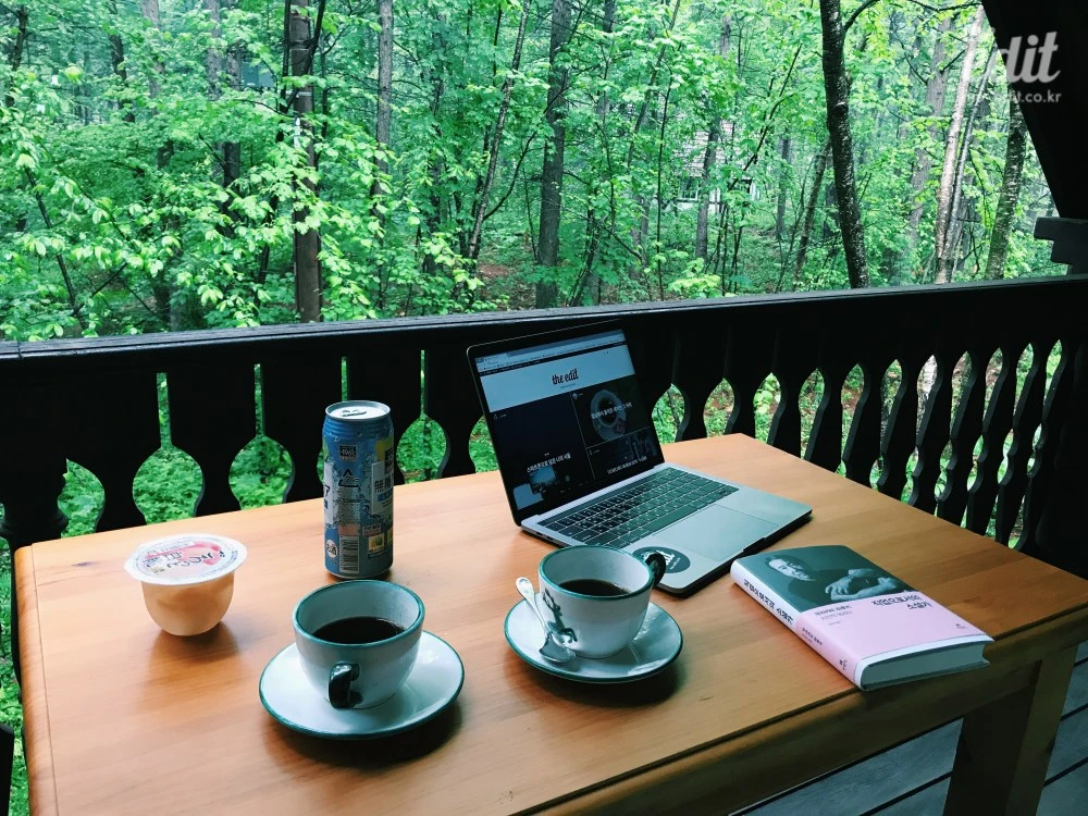 이번 여행에서 최고의 순간을 꼽자면 2층 테라스에서 빗소리를 듣던 시간이다. 셋째 날엔 아침부터 비가 내렸다. 약한 빗줄기가 하루종일 그치지도 않고 꾸준히 내리더라. 방 안에 있던 책상과 의자를 들고 나가서 상을 차렸다. 마트에서 사 온 커피도 내리고, 과자도 한 봉지 뜯고, 맥주도 마시고. 나는 하루키의 에세이를 읽고, 친구는 자기 나름대로 할 일을 했다.