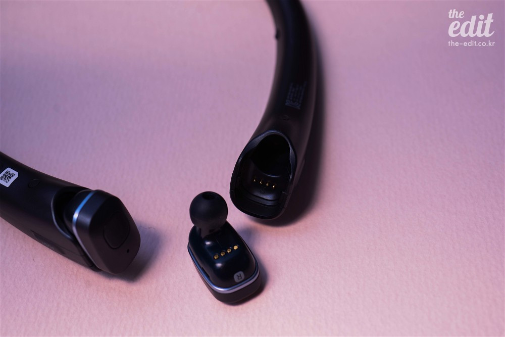 오직 거치만을 위해서 거추장스러운 넥밴드를 제공하는 건 비효율적인 일이다. 다들 예상했겠지만, 넥밴드는 배터리를 품고 있다. 사용하지 않는 동안 이어버드를 꽂아두면 자동 충전이 된다. 완전 무선형 이어폰은 디자인이나 착용감을 위해 크기를 최소화하는 것이 일반적인데, 그러다 보면 물리적인 공간이 모자라 배터리도 줄어들 수밖에 없다. 톤플러스 프리는 음악 재생시간 기준 최대 3시간까지 연속 사용할 수 있는데, 넥밴드로 충전하면 사용시간을 7시간 이상으로 연장할 수 있다.