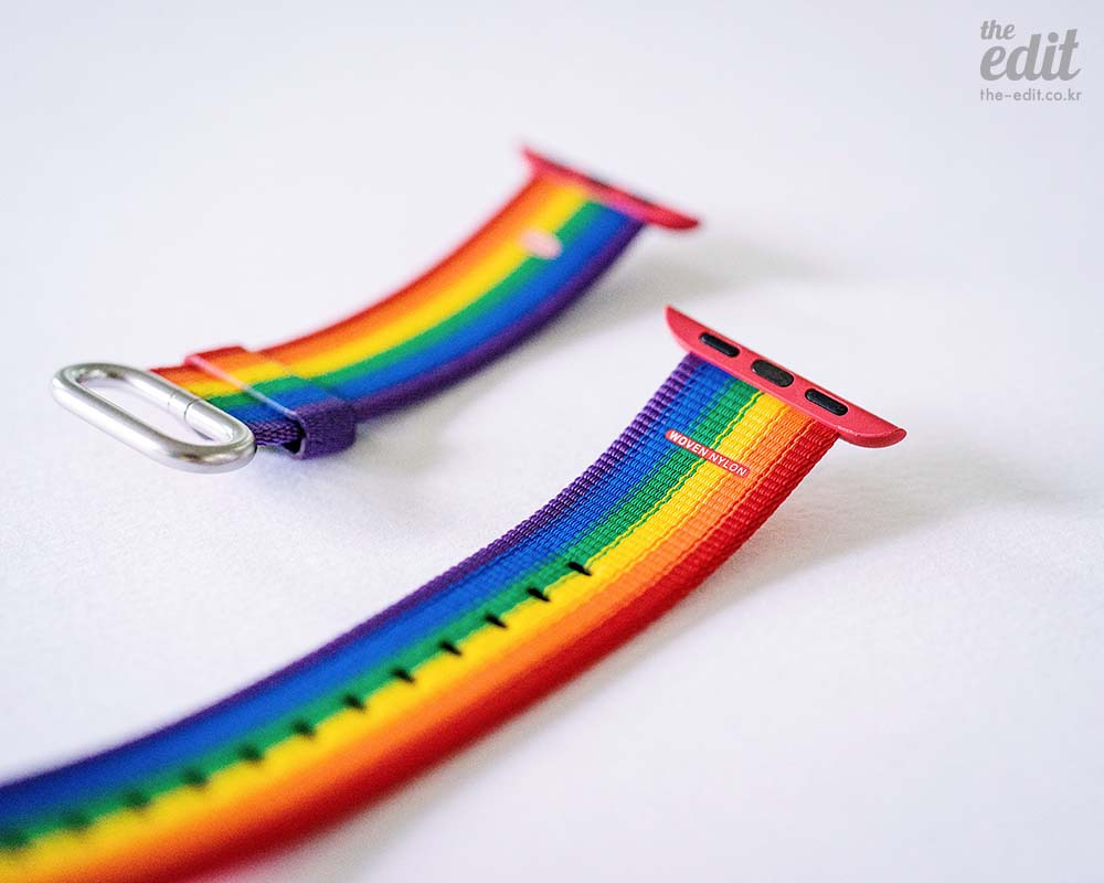 1년이 지나고 드디어 이 밴드가 프라이드 에디션이라는 이름으로 정식 출시됐다. 의미도 좋지만 난 원래 무지개를 좋아한다. 예쁘니까. 우븐 나일론은 보기 보다 섬세한 소재다. 500가닥 이상의 실을 일정한 방식으로 엮어 컬러풀한 패턴을 완성하는 태피스트리 직물이다. 가볍고 견고하며, 다른 워치 밴드에 비해 가격도 합리적인 편.