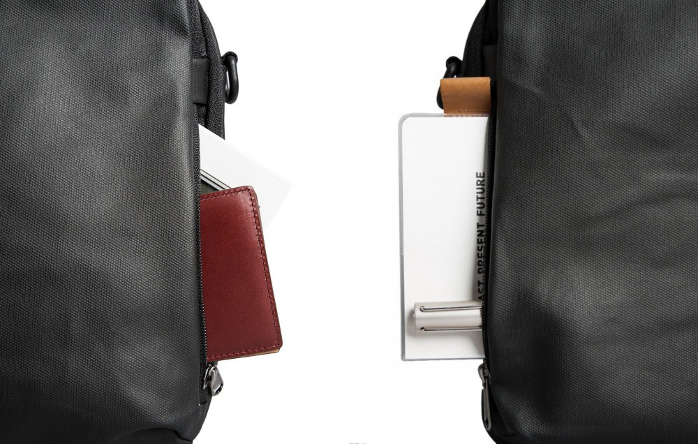 슬쩍 보기엔 가죽 혹은 레자처럼 보이는 반질반질한 소재인데, 캔버스 원단에 우레탄 코팅을 입혔단다. 덕분에 물에 젖지 않고 오염에도 꽤 강한 편이다. 특별한 날에 드는 것이 아니라, 매일 들어야 하는 업무용 혹은 데일리 백은 무게와 때가 타지 않는 것이 가장 중요하다. 가방 내부도 방수가 되는 PVC 원단을 사용했다. 13인치 노트북이 들어가며 사이즈는 29x39x8cm. 무게는 650g.