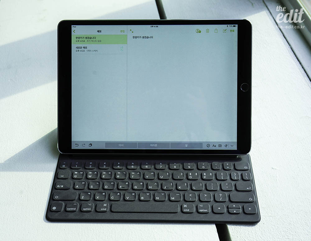 10.5인치용 스마트 키보드는 9.7인치 버전보다 키보드 간격이나 크기가 여유로워졌다. 한/영 버튼이 생겼다는 점이 의미 있는 변화. 나는 원래 저 버튼으로 한영 전환을 하지 않기 때문에 별 감흥 없지만, 조금 더 한국 사용자의 편의를 챙겼다는 점에서 바라보기로 한다.
