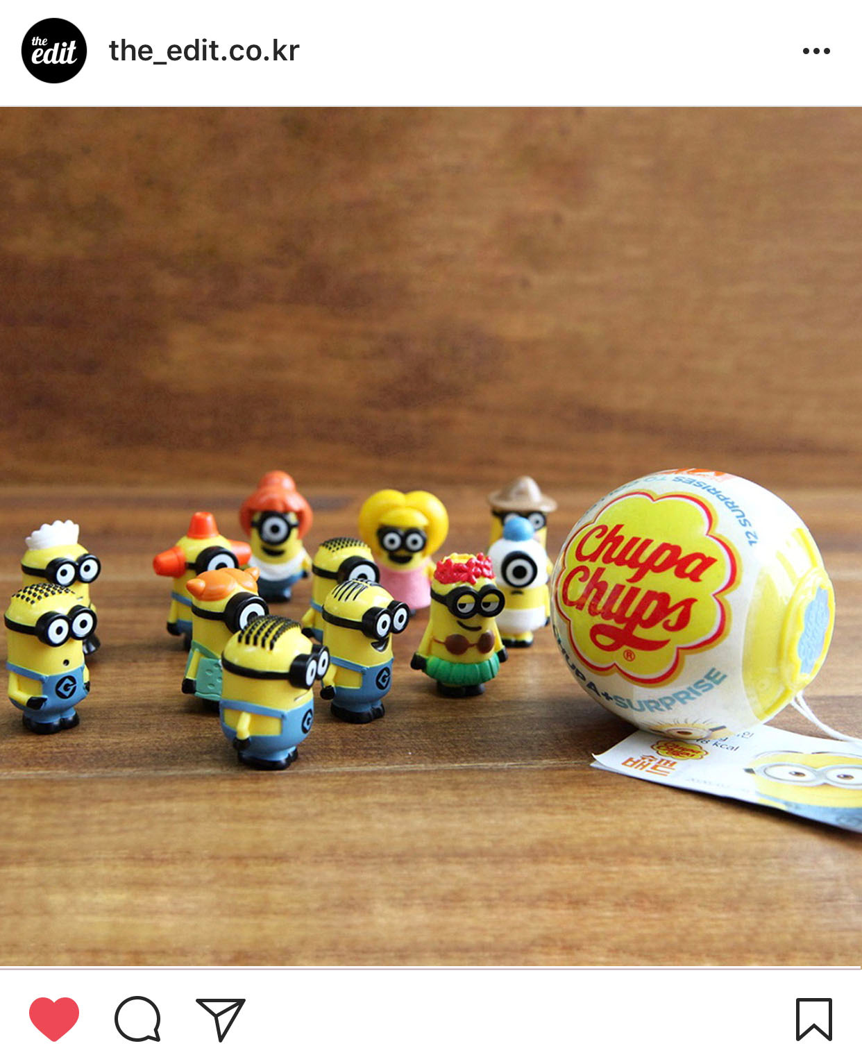 또 미니언즈다. 이렇게 많은 미니언즈 제품이 쏟아져 나오는 데는 다 이유가 있는 법. 나도 당신도 우리 모두 귀여운 멜빵바지를 맞춰입고 하루종일 알아듣기 힘든 말을 쨍알대는 미니언즈를 격렬히 사랑하고 있으니까. 미니언즈가 이번엔 츄파춥스와 만났다. 흡사 포켓몬 볼을 닮은 동그란 플라스틱 안에 12종 중 한 개의 미니언즈 캐릭터가 랜덤으로 담겨있다. 아쉬운 건 사탕이 모두 스트로베리 맛뿐이라는 것. 개인적으로 딸기 맛을 별로 좋아하지않아서 아쉽지만(츄파춥스는 콜라지!) 우리가 이걸 3천 원이나 내고 사는 진짜 이유는 사탕 때문이 아니니까 모른척하자. 손톱 만한 크기의 앙증맞은 악당을 모두 모으고 싶어지니까 하트는 ON.