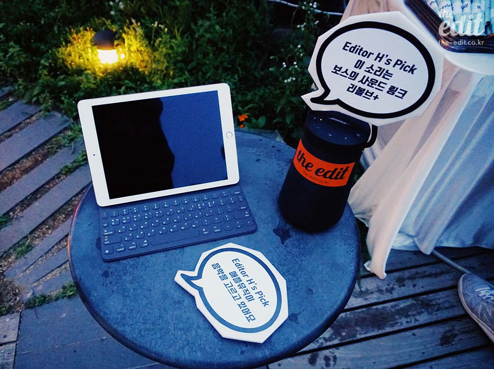 완벽한 순간을 위해 내가 섭외한 스피커는 보스의 제품. 어디 갖다 놔도 예쁜 사운드링크 리볼브+. 덩치가 작은 스피커라 걱정했지만, 수 십 명의 사람들이 떠들고 있는 파티 자리에서도 자기주장 강한 사운드를 들려 주더라. 나한테 “음악 어디서 나오는 거예요?”라고 물어본 사람이 있었을 정도.