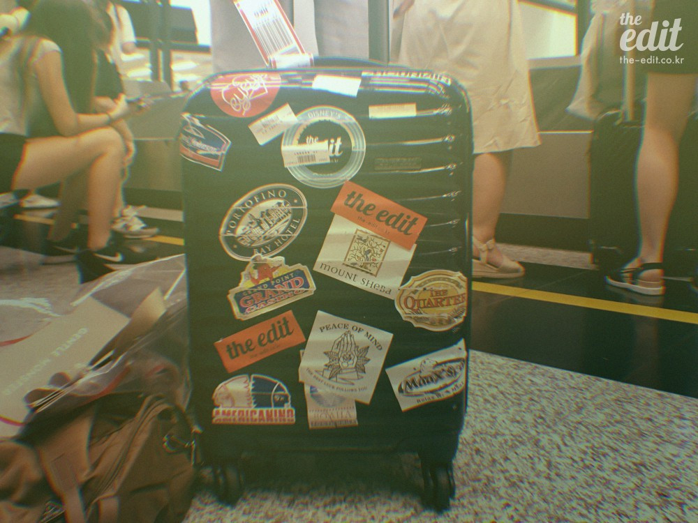 수년 전에 산 내 캐리어. 워낙 흔한 디자인과 컬러라 스티커를 덕지덕지 붙여놨다. 수많은 스티커 중에서 압도적인 존재감을 보여주는 디에디트 스티커.