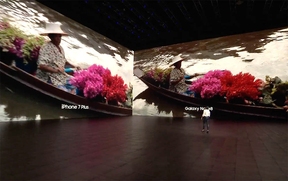 듀얼 카메라의 문제는 항상 둘 중의 하나가 너무 쳐진다는 건데, 갤럭시 노트8에 들어간 카메라를 살펴보자. 하나는 77도 화각, F1.7 렌즈의 광각카메라. 다른 하나는 45도 화각, F2.8의 망원 카메라다. 둘다 1,200만 화소. 두 개의 카메라를 이용해 촬영 화면에서 광학 2배줌과 디지털 10배 줌을 지원한다.