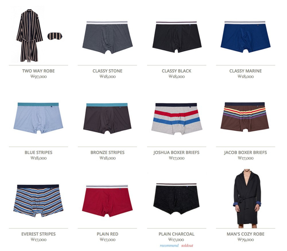 여자 속옷으로 시작하긴 했지만, 인에이는 남자 속옷도 있다. 내가 인에이를 좋아하는 가장 큰 이유는 역시 디자인이다. 의외로 이런 심플한 컬러배색은 찾기 참 어렵다. 다 괜찮은데 꼭 없어도 되는 디테일이 꼭 하나씩 있더라고. 아쉽게. 덜어 내는 건 쉬워보여도 어려운 일이다. 디자인이 단순해지면 화려함에 가려졌던 제품의 질이 여실히 드러난다. 좋은 원단을 쓰지 않으면 이렇게 단순한 디자인을 유지하면서도 세련된 느낌을 내기 힘들다.