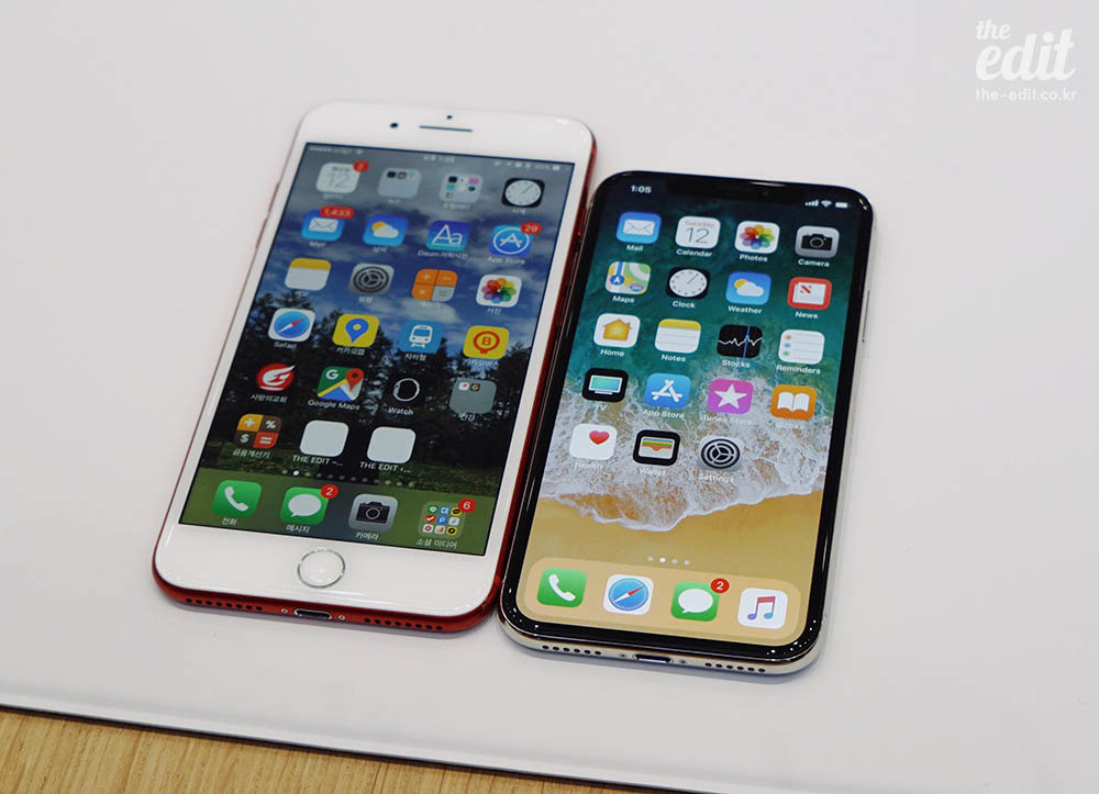 아이폰X의 화면 크기는 5.8인치. 화면으로만 따지면 역대 어떤 아이폰보다도 큽니다. 제가 현재 사용중인 5.5인치 아이폰7 플러스와 나란히 두고 비교해볼까요. 아이폰X이 훨씬 작죠. 실제로 제품 크기는 아이폰7(혹은8) 보다 조금 더 큰 정도입니다.