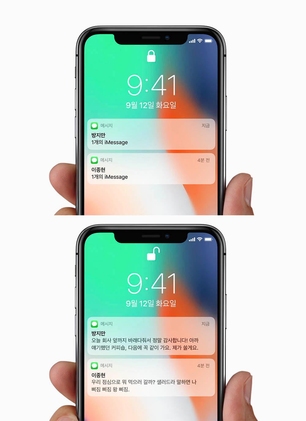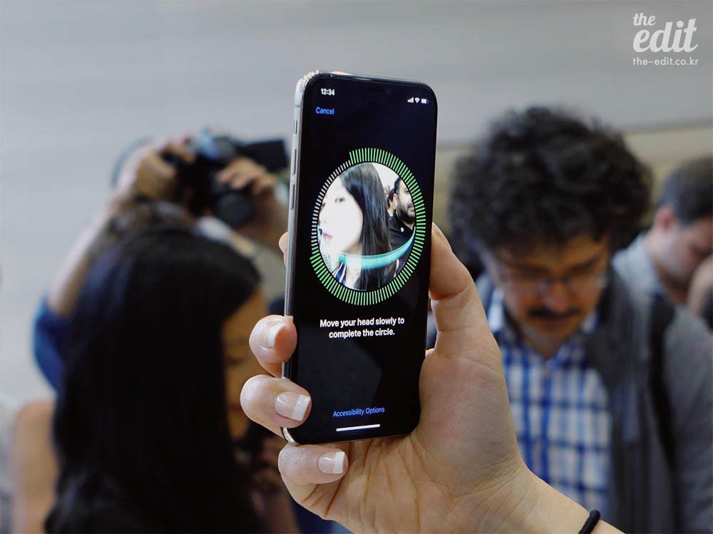 제가 수많은 인파를 뚫고 아이폰X 페이스 ID에 제 얼굴을 등록해보고 왔습니다. 처음에 등록할 땐, 내 얼굴을 빈틈없이 모든 각도로 보여준다고 생각하고 카메라를 향해 목운동 하듯 고개를 돌리면 됩니다. 원을 그리면서 한 바퀴 돌려줘요. 이 촬영 과정을 두번 거치면 등록 완료. 바로 사용해봤습니다. 잠금 화면 상태에서 내 얼굴을 폰 앞에 갖다대면 바로 잠금 해제. 자물쇠 아이콘으로 잠금 해제 상태를 표시해줍니다. 생각보다 빠르더군요.