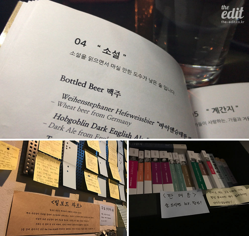 술을 마시면 책을 10% 할인해준다. 원래 나는 서점에 오면 어떤 책이 있나 구경부터 하는 사람인데, 이날은 함께 들어온 손님들이 주문한 알코올 향에 홀려 벌컥 메뉴 판부터 열었다. 책에 등장하는 술 “책 속의 그 술”, 시 한 편 읽으면서 마실 만한 도수 높은 술 “시”, 그 외 ”에세이”,“소설”, ”계간지”, “별책 부록” 등. 메뉴판에는 취향과 목적에 따라 골라 마실 수 있는 술이 들어 있었다. 그중 나는 개츠비의 술, 진 리키를 마셨다. 계피 맛과 알코올 향이 싸 하면서 따뜻한 차의 느낌이 든다.