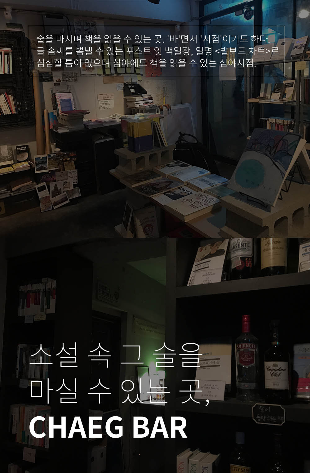 왜, 그런 거 있잖아요. 개츠비가 게걸스럽고도 단숨에 들이켠 저 술은 어떤 맛일까 궁금해하는 거. 같은 걸 마시면서 읽으면 같이 있는 기분이 들 것 같은 거. 언젠가 그 술을 마시며 책을 읽어야지 다짐했는데. 이런 내 로망을 먼저 실현한 곳이 바로 ‘책바’다. 주인장이 혼자 오는 손님을 반긴다고 직접 언급한 만큼 혼술, 혼북 하기 좋은 최고의 공간이다.