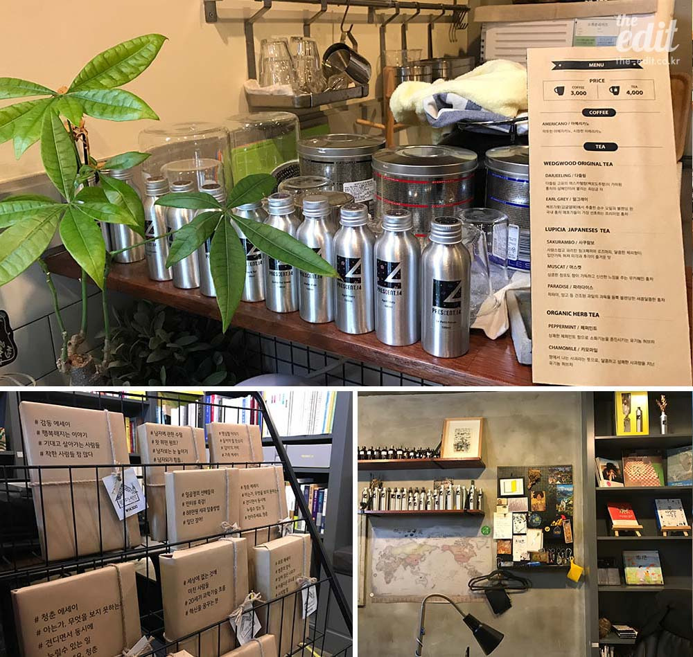한적한 곳에 위치한 프레센트.14는 책과 함께 향기를 판다. 입구 앞 진열장에는 책을 향기로 표현한 디퓨져들이 가득하다. 라일락과 상큼한 과일 향을 조합한 <어린 왕자> 향, 따뜻하고 맑은 느낌을 낸 <냉정과 열정 사이>의 향은 집에 데려가고 싶었을 정도다. 사실 다양한 향기들이 섞여 답답할까 봐 걱정했는데, 우려와는 달리 조화로운 향이 머무는 공간이었다.